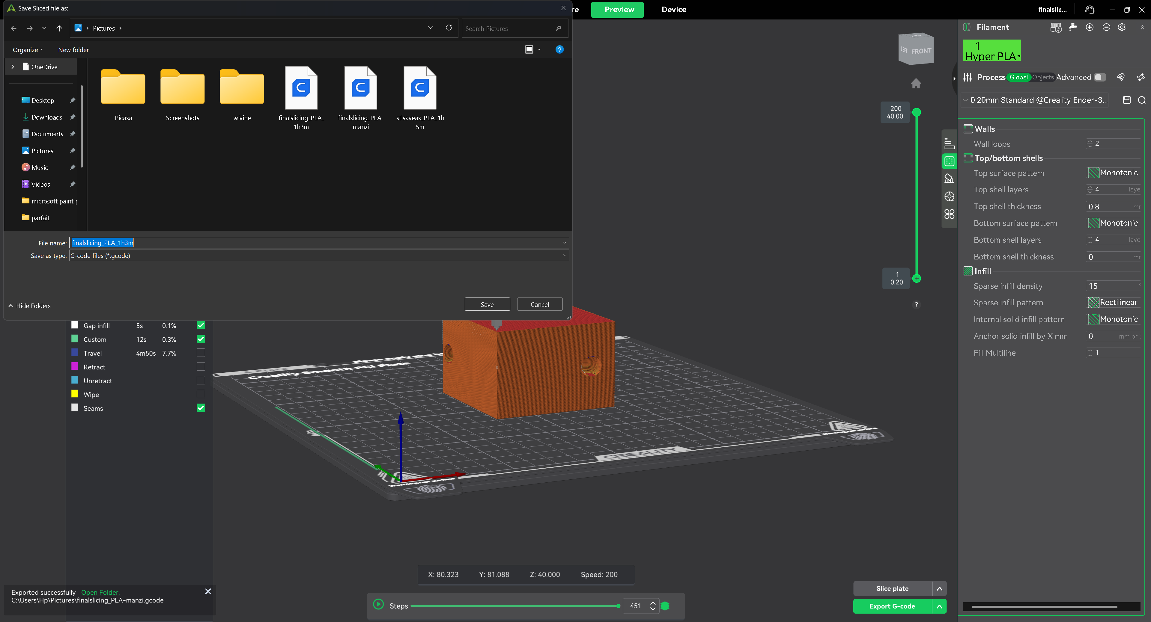 the slicing process was complete, I exported the sliced model by selecting “Save as G-code” in Creality Slicer. This file contains all the instructions needed for the 3D printer, including movements, speeds, and extrusion settings