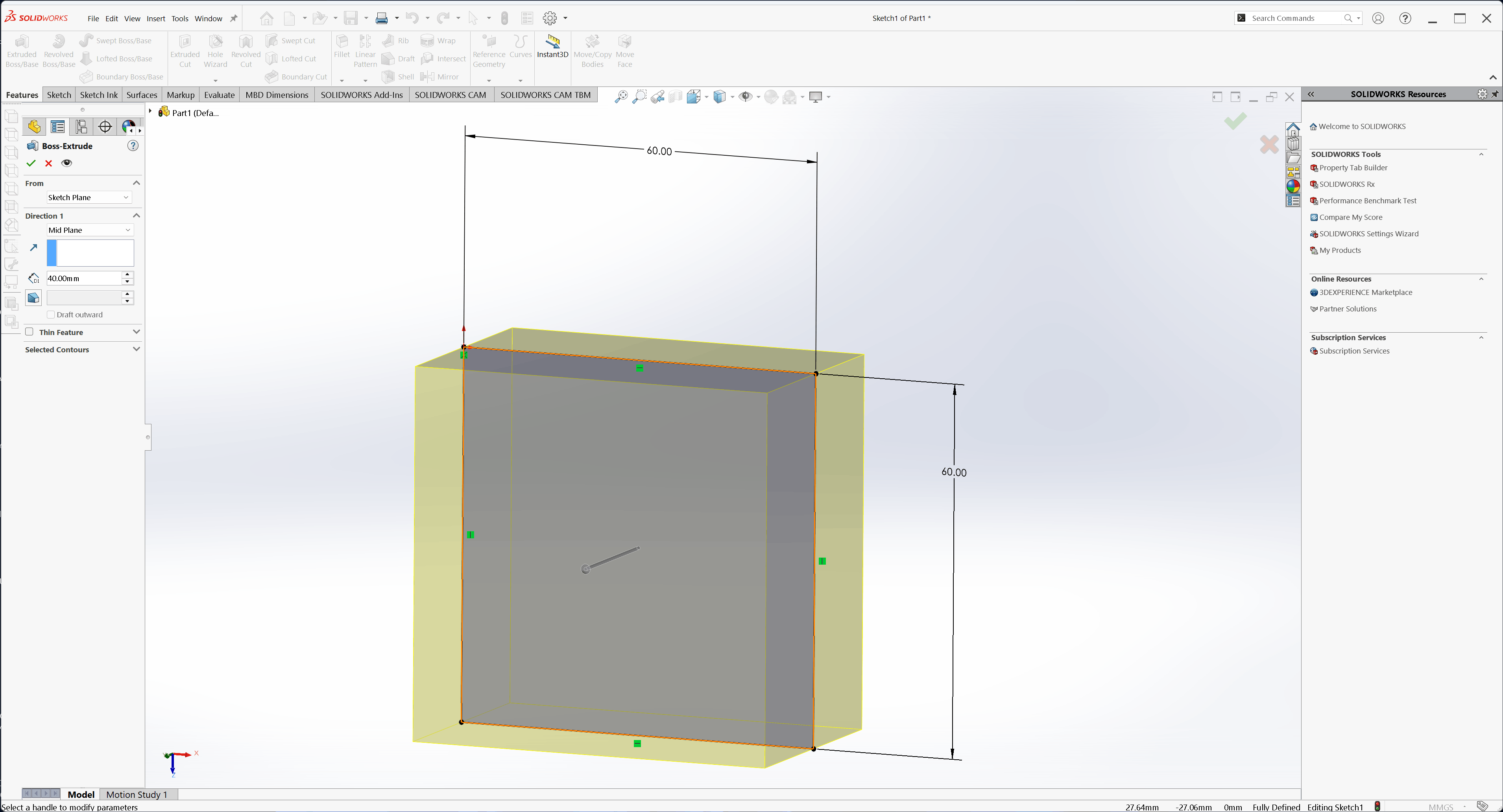 I selected the Front Plane as the reference plane for the initial sketch, drew a square to define the base of the cube, and then used the Extrude feature to create the 3D shape
