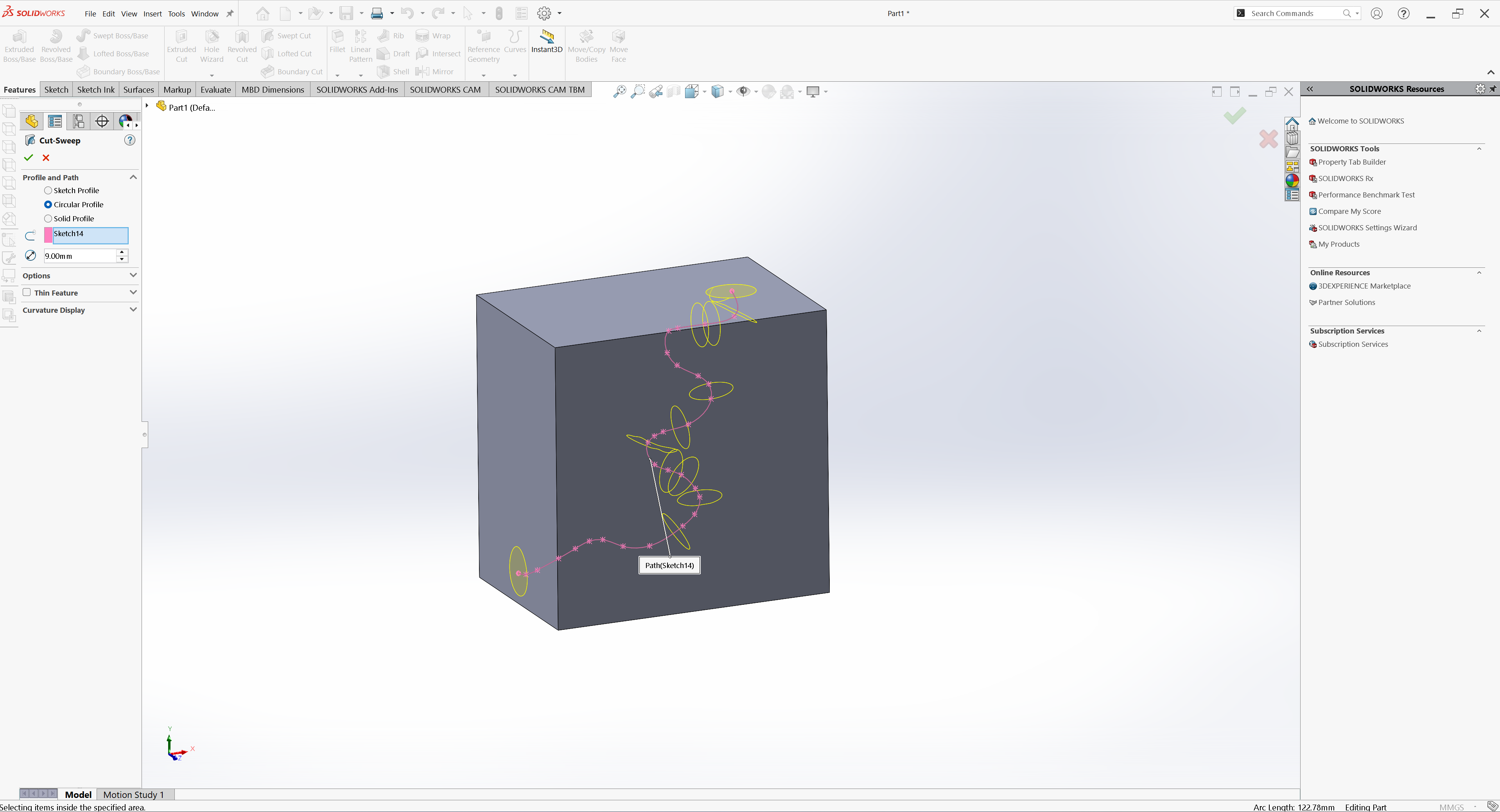 The Swept Cut successfully removed material along the defined path