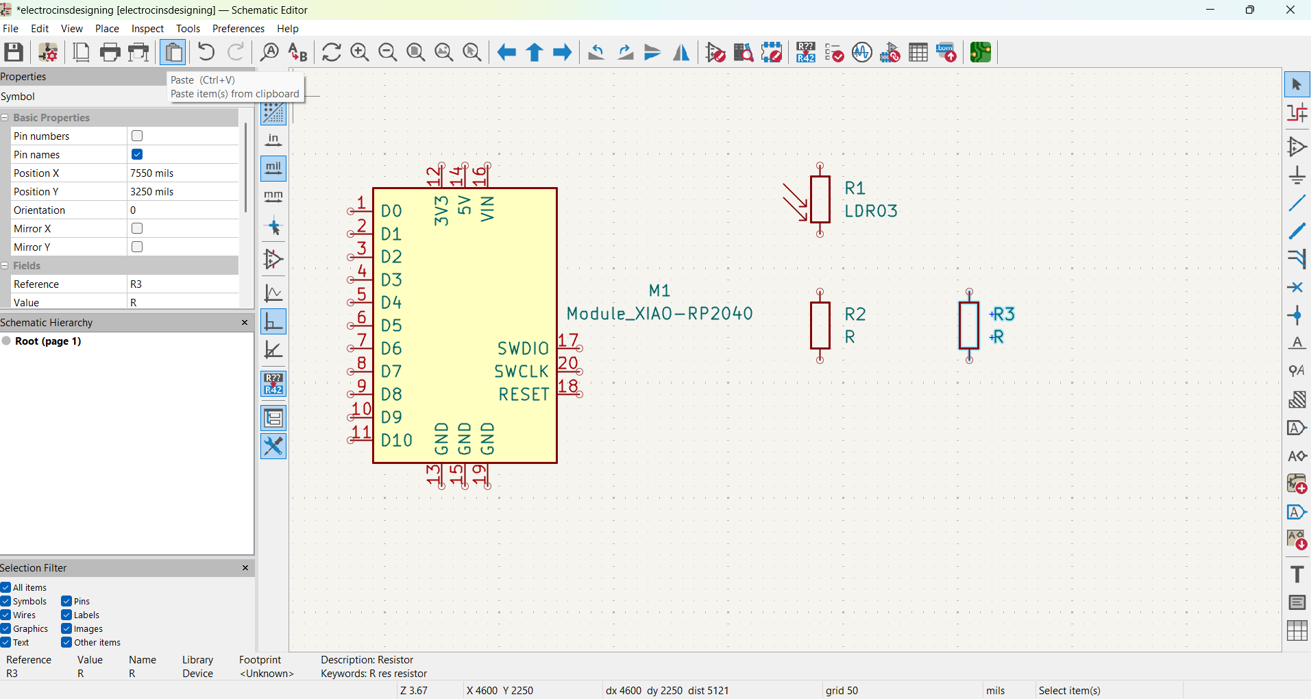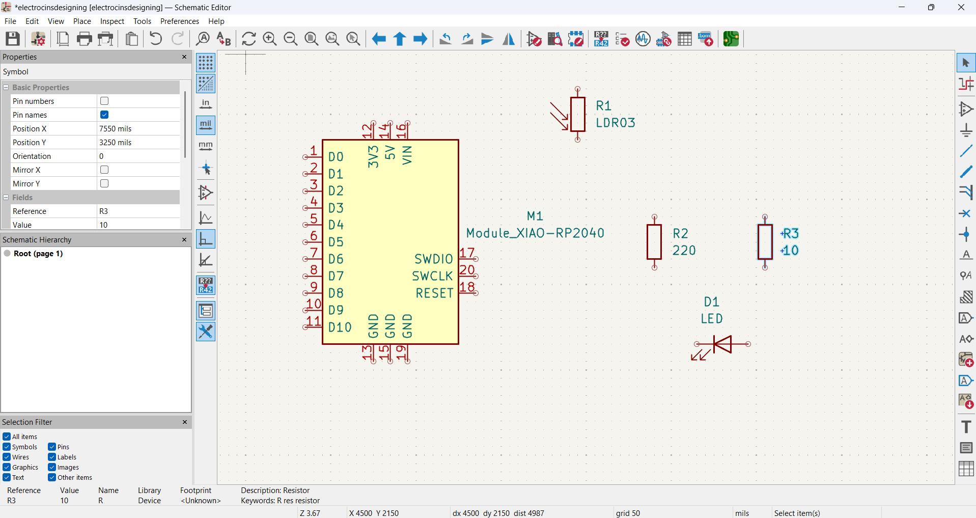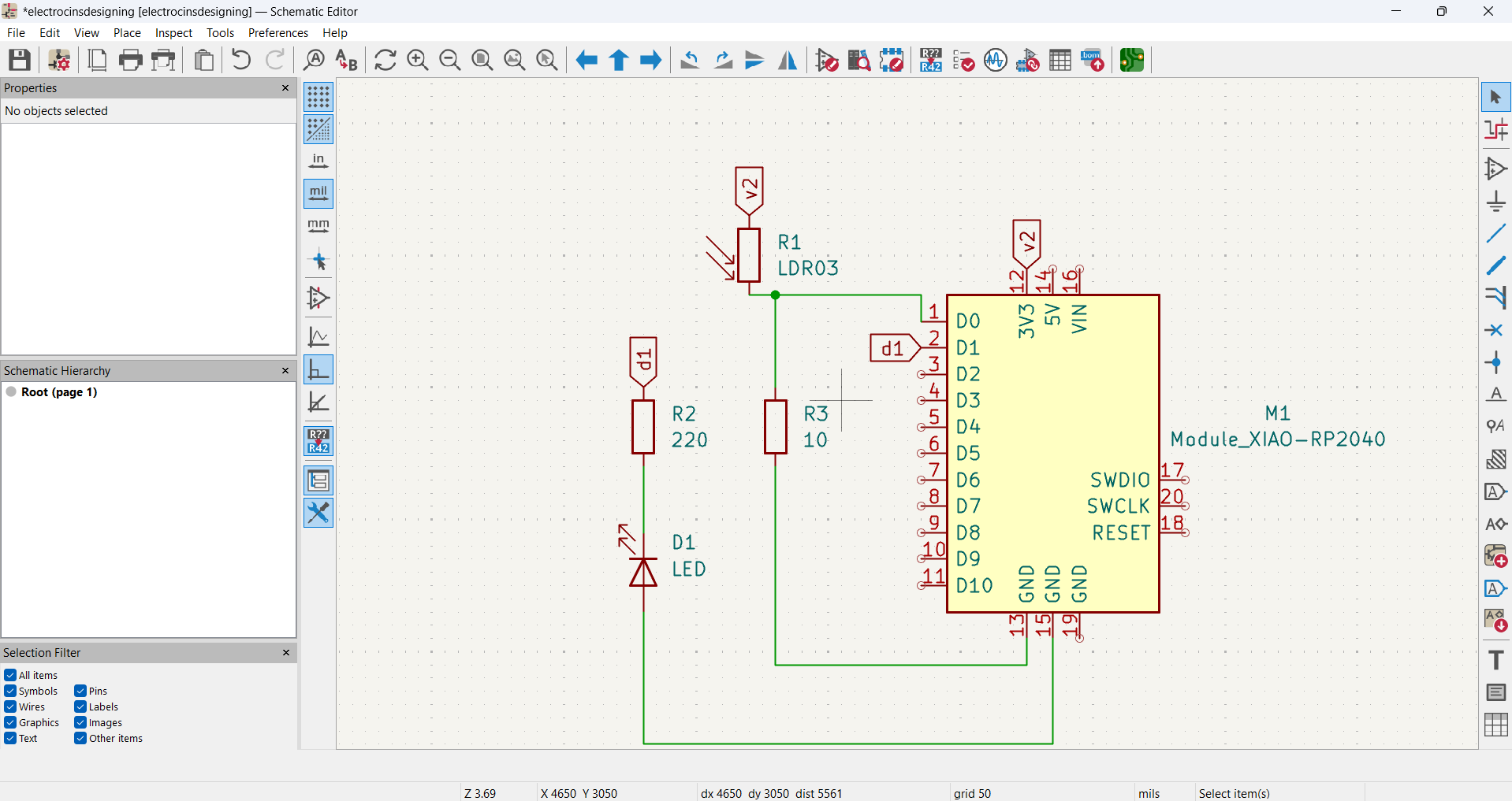 Next, I connected all the components by wiring and Place Global Labels to keep the schematic clean the XIAO RP2040 pins, LDR, resistors, and LED according to the circuit schematic