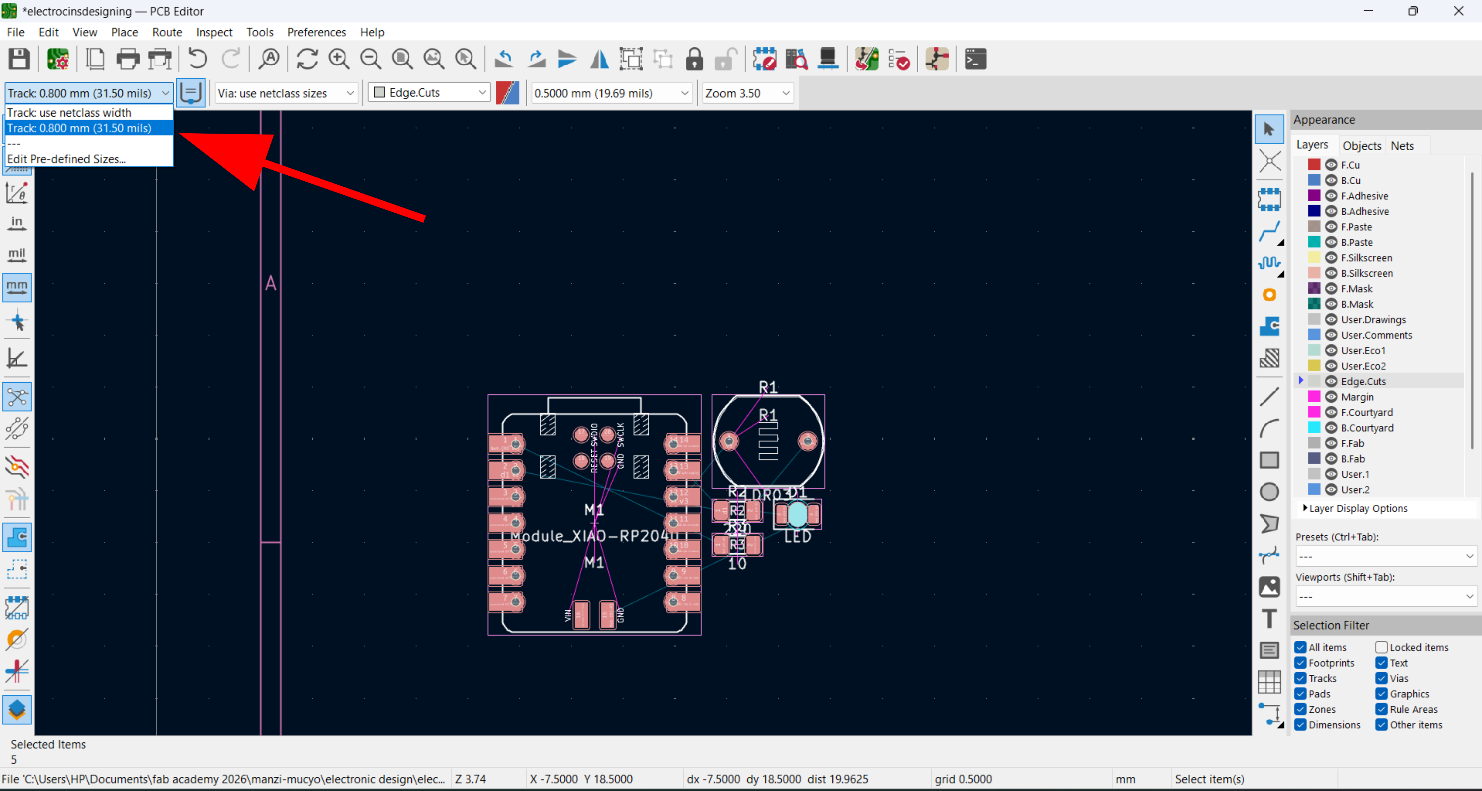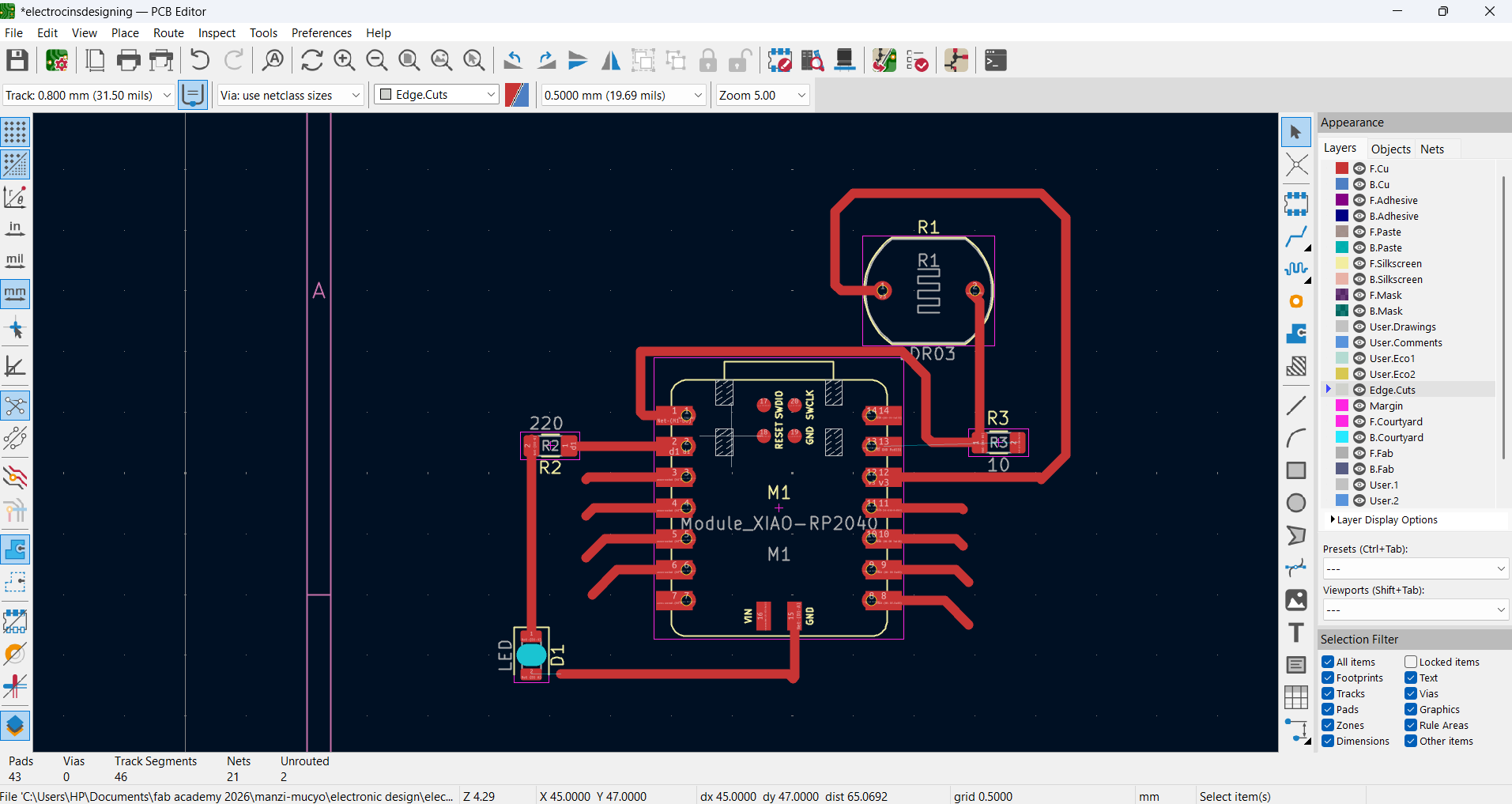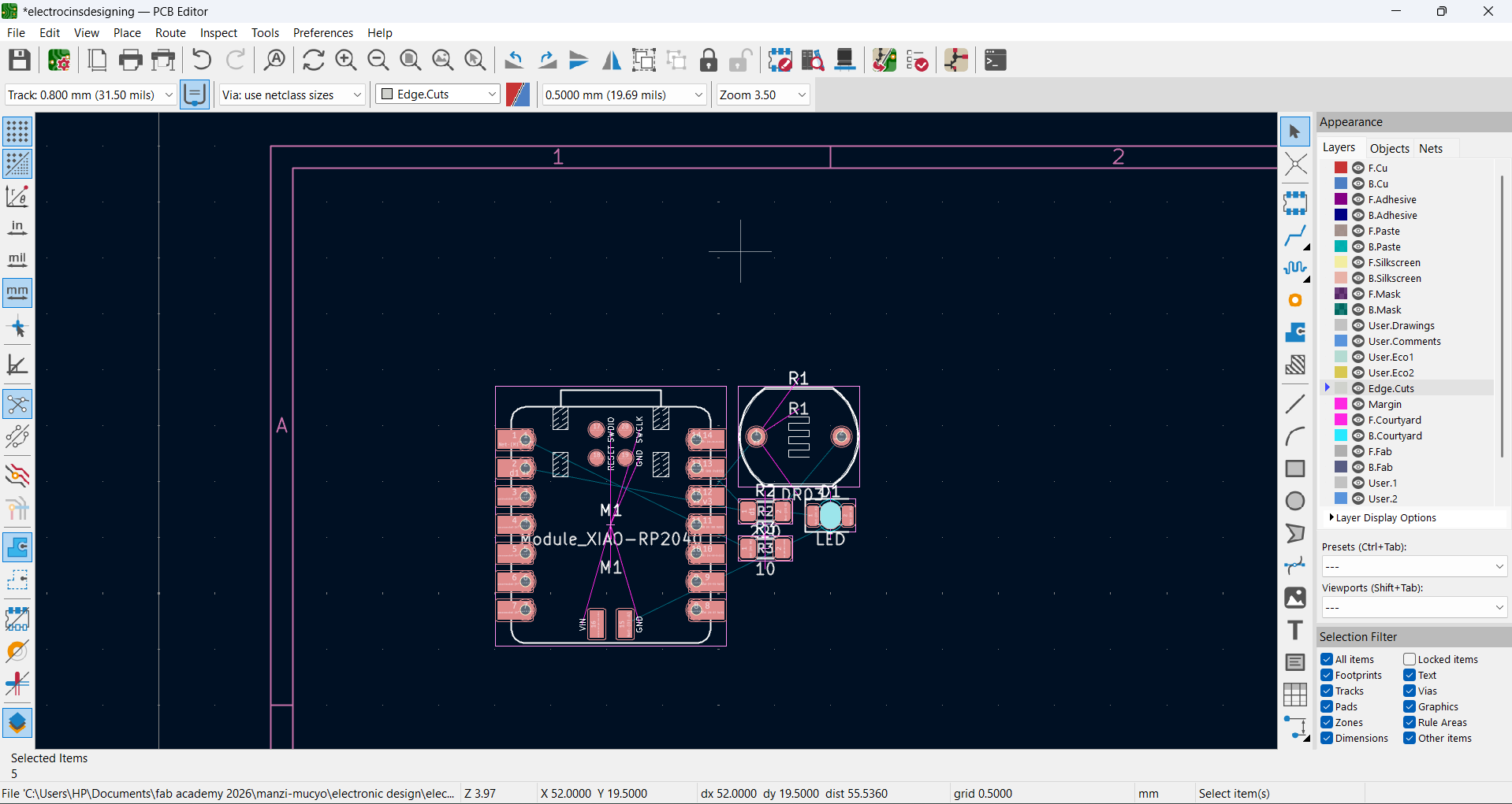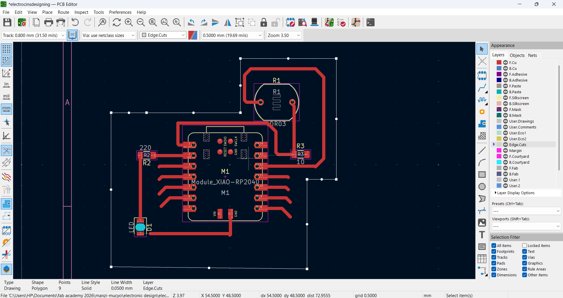 After completing the track routing, I added edge cuts to define the final shape and outline of the PCB