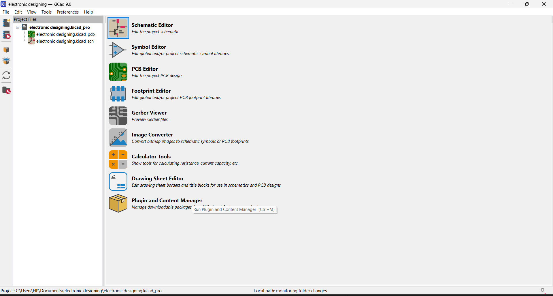 I opened KiCad and created a new project by selecting File → New Project, preparing the workspace for schematic