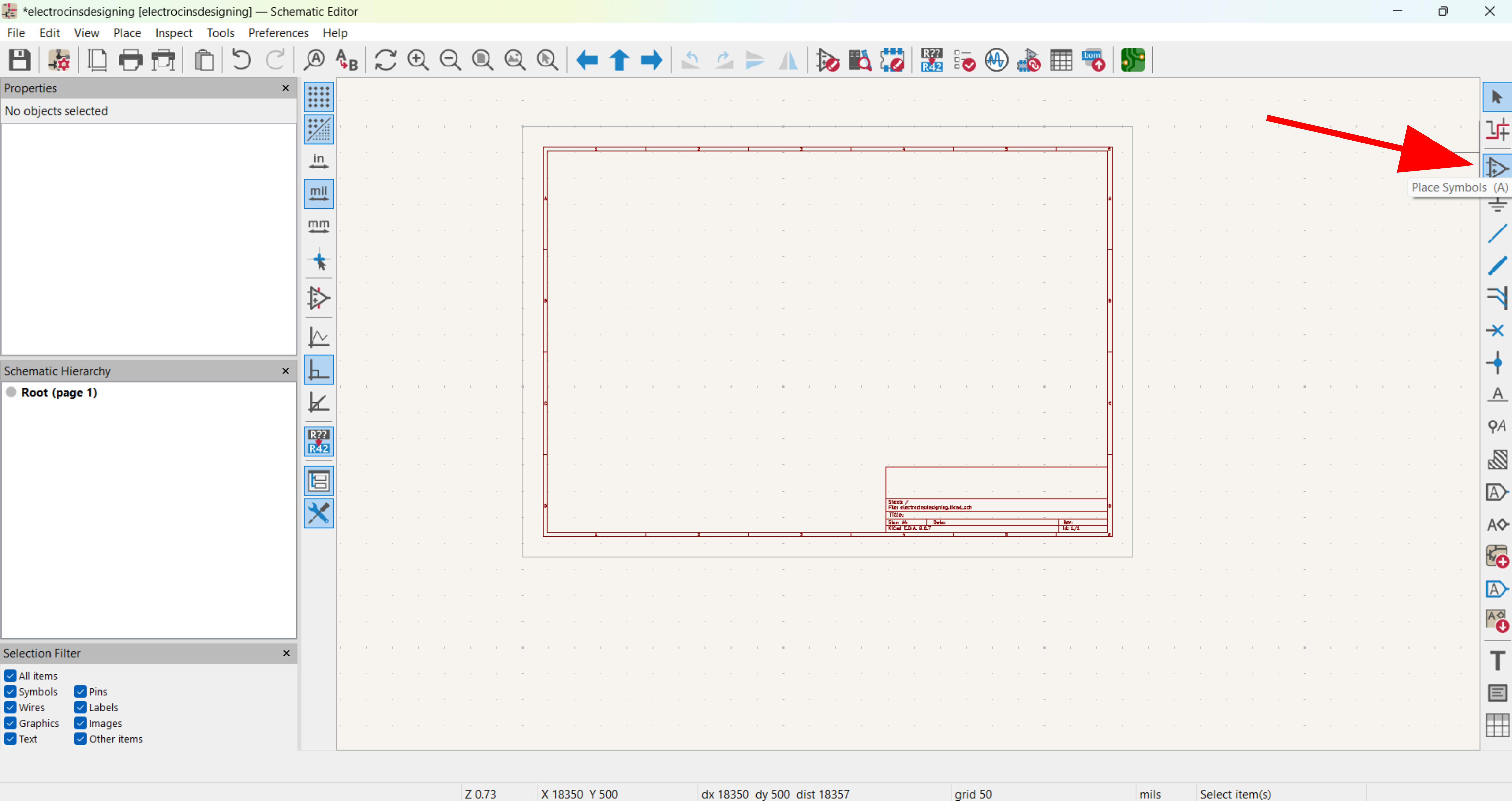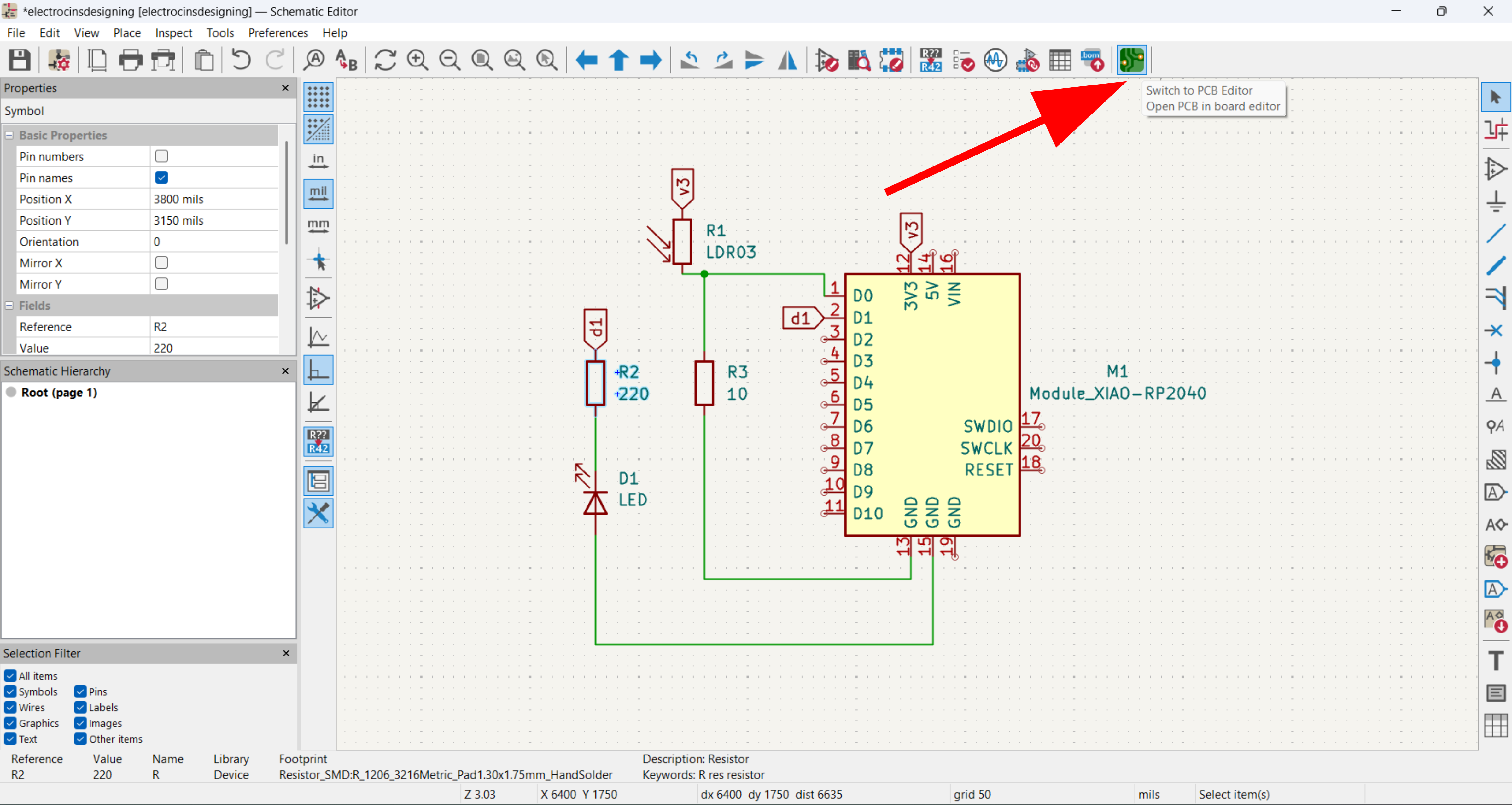 I opened the Schematic Editor and used the Symbol Tool to add the XIAO RP2040 microcontroller