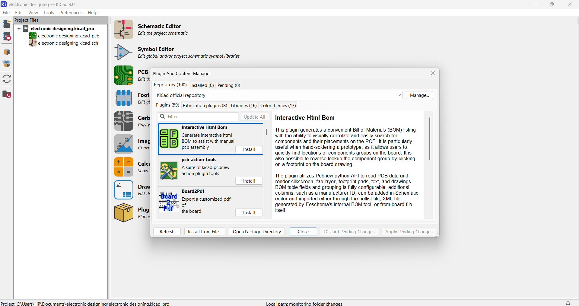I installed the required component libraries in KiCad to ensure all necessary symbols and footprints were available for my PCB design Next, select plugin and content Manager and choose library for adding fab library