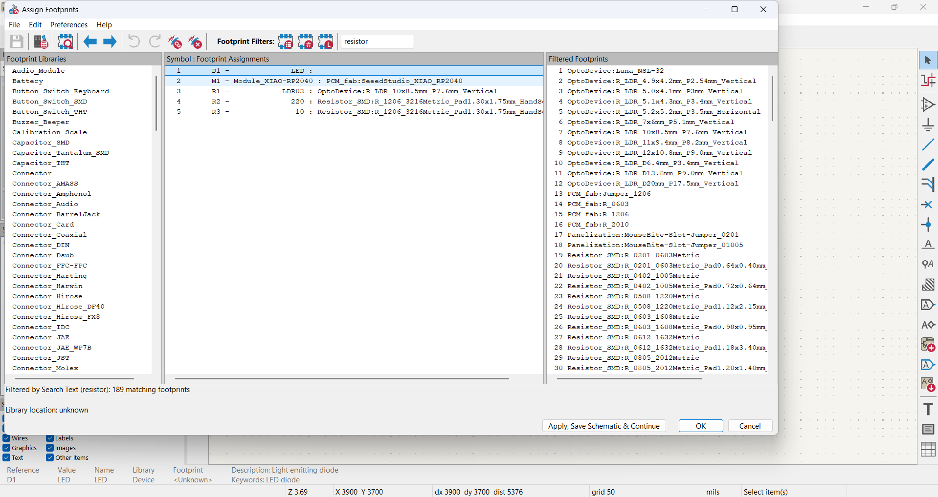 Next, I assigned footprints to verified that all connections were correct and All components were correctly connected