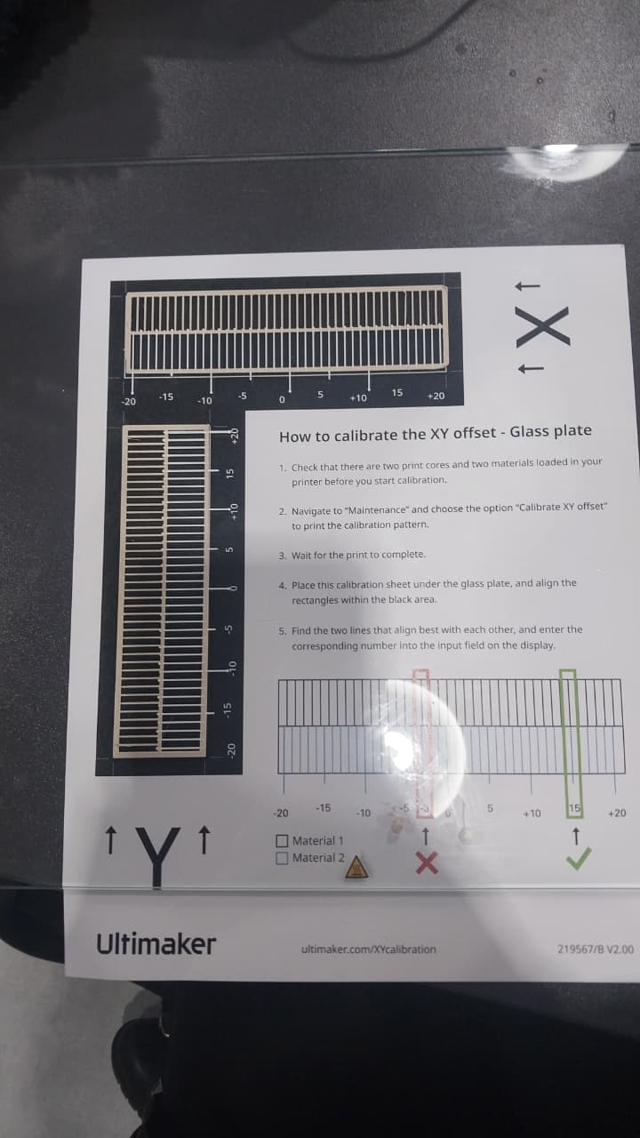 After the test pattern was printed, I checked the alignment of the first filament with the second one using this sheet as a reference.