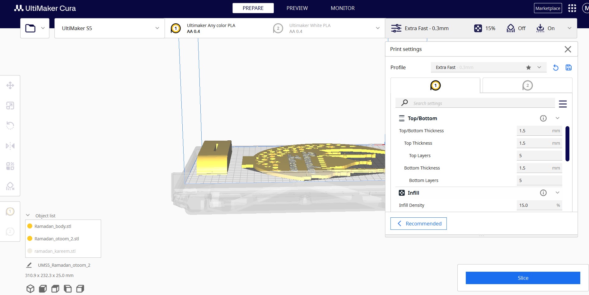 Then, I prepared the models for printing using Ultimaker Cura and other 3D software.