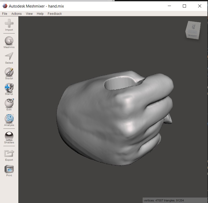 First, I wanted to try using the 3D scan of my hand to create a functional object. I thought it would be interesting to see how the scanned data could be used to create a custom-fit pen holder.