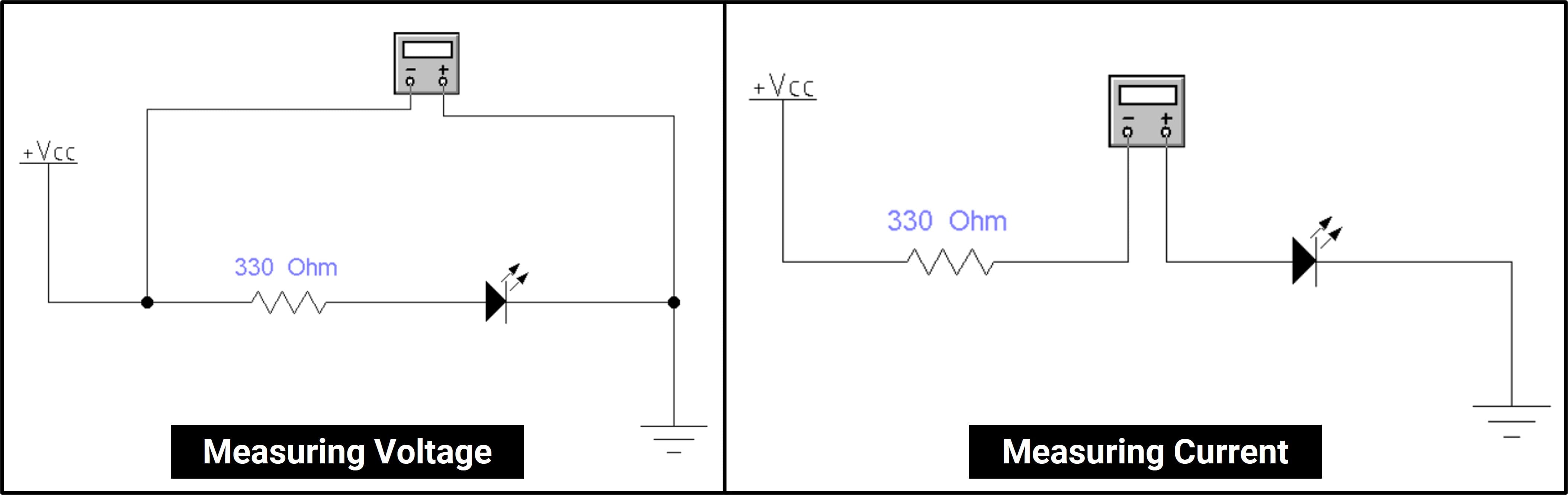 To measure voltage with a multimeter, connect probes in PARALLEL across the component.