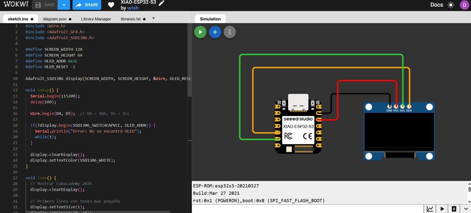 This code controls an OLED display (SSD1306) using a XIAO ESP32-S3 and Adafruit libraries. In the setup, it initializes serial communication, starts I2C communication with custom SDA and SCL pins, and initializes the OLED display, stopping the program if the display is not detected. In the loop, it alternates between two screens: first showing “Fabacademy 2026” with different text sizes, and then displaying the name “Daniel Haro.” Each screen is cleared, updated, and shown on the display, with a 3-second delay between transitions.