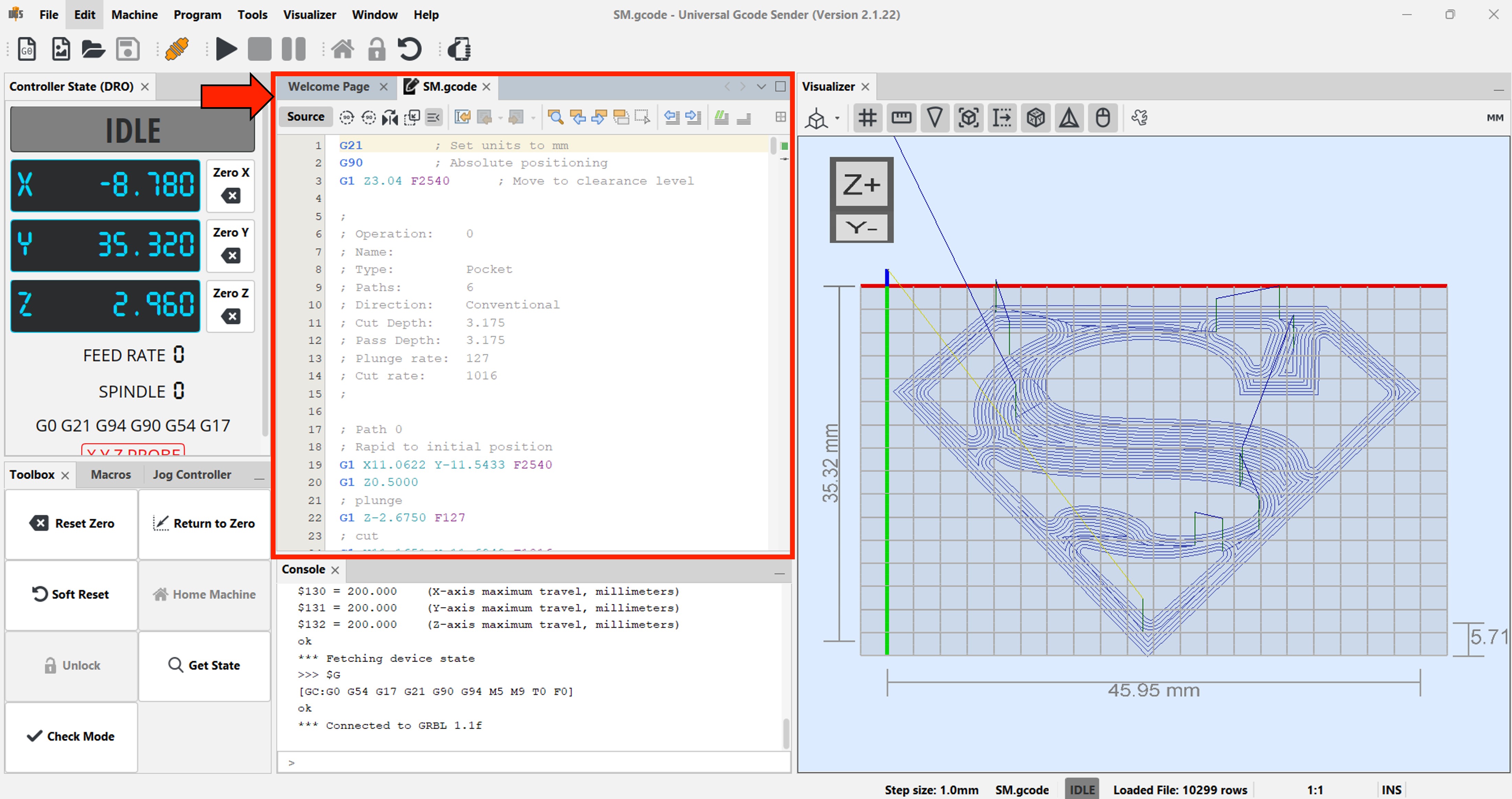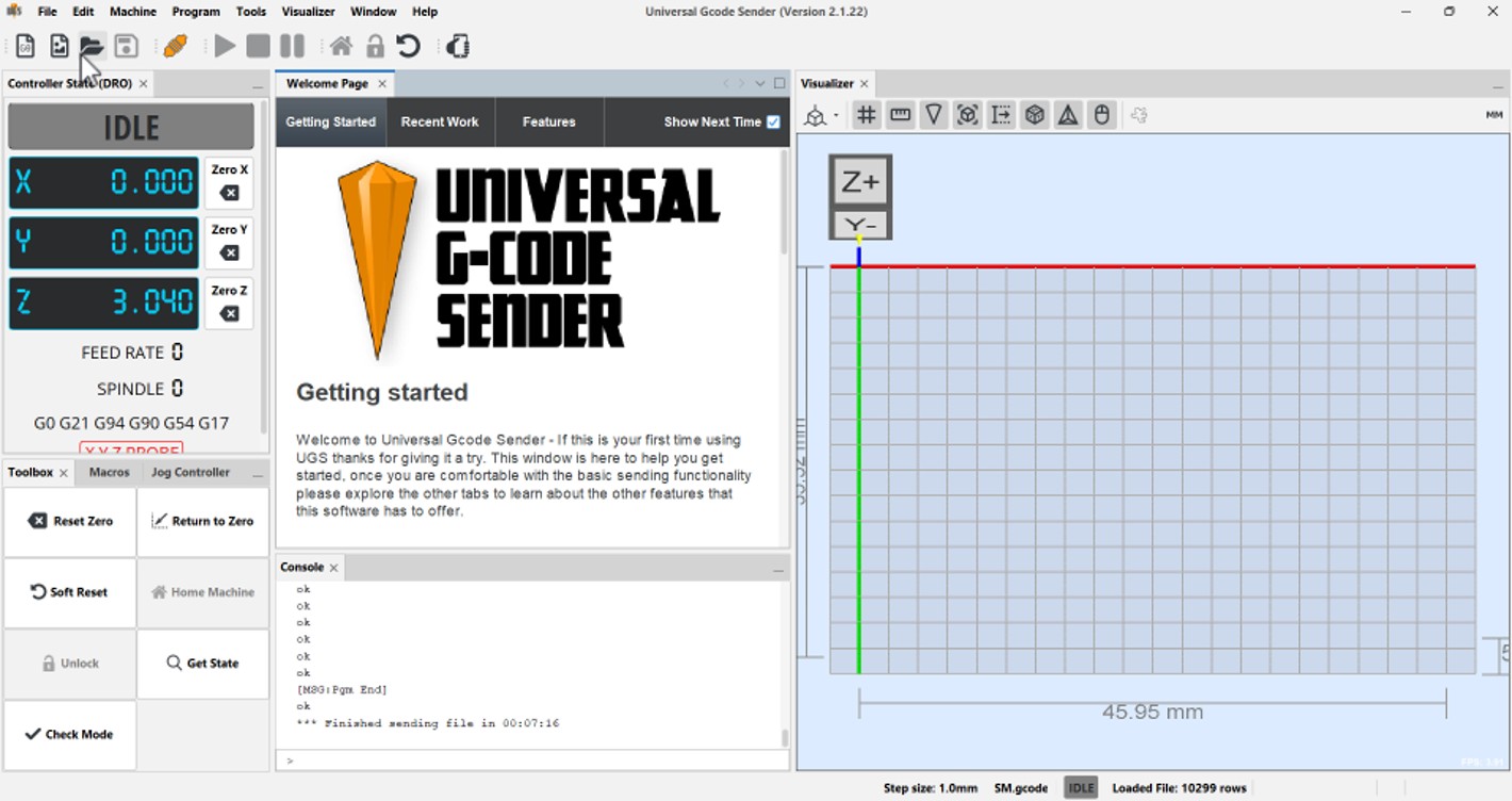We will load the G-Code file that we generated with the JsCut application.