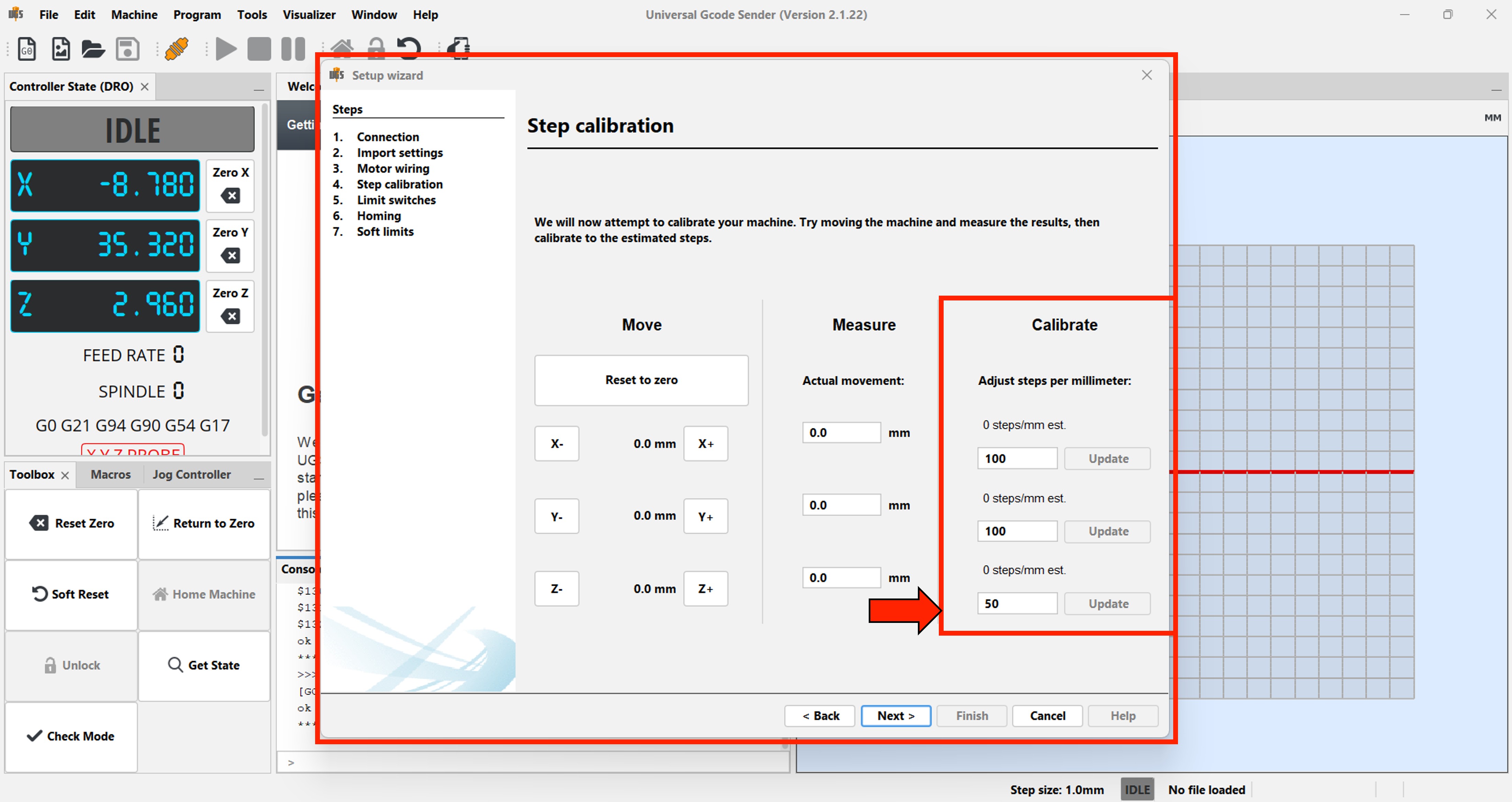 - Calibration process Adjusting steps per millimeter and movement limits was necessary to achieve acceptable results.