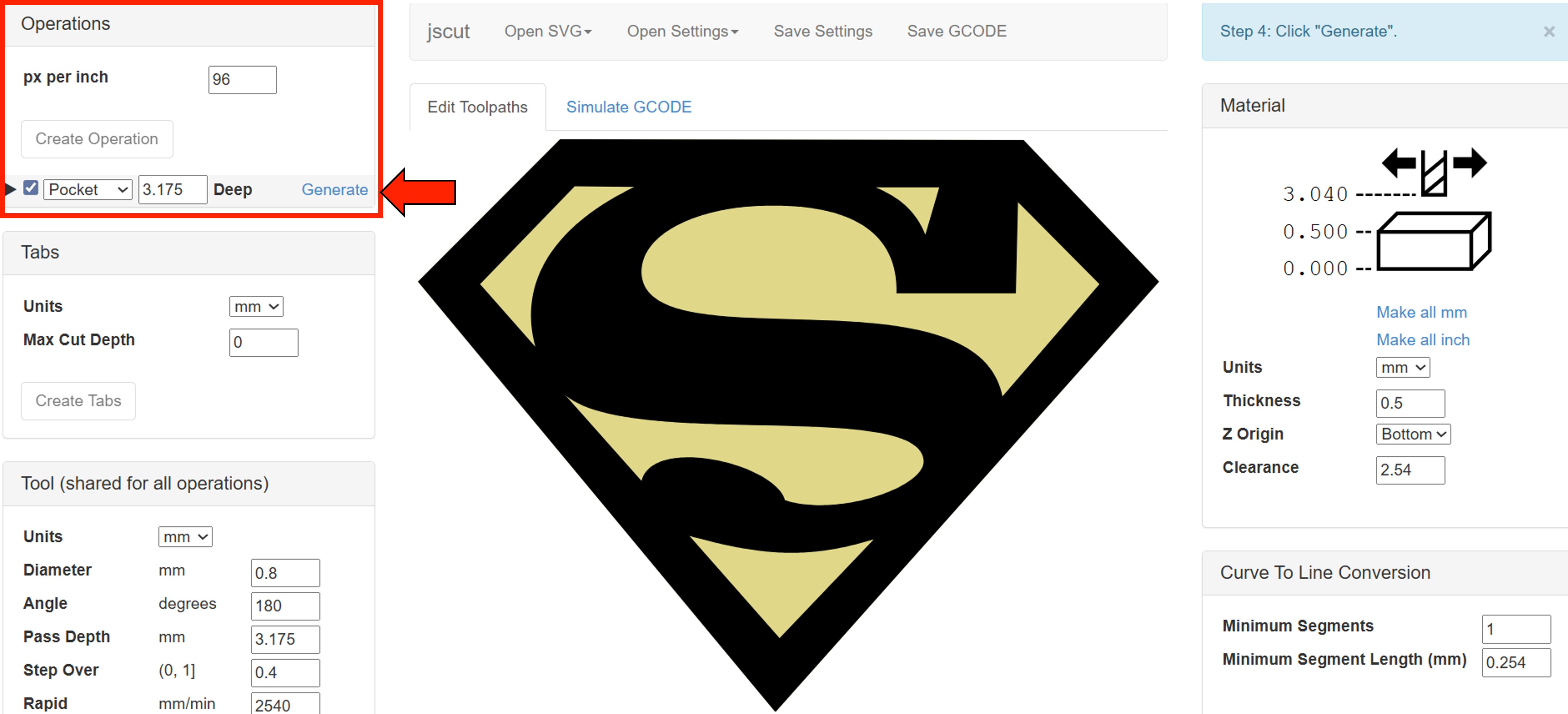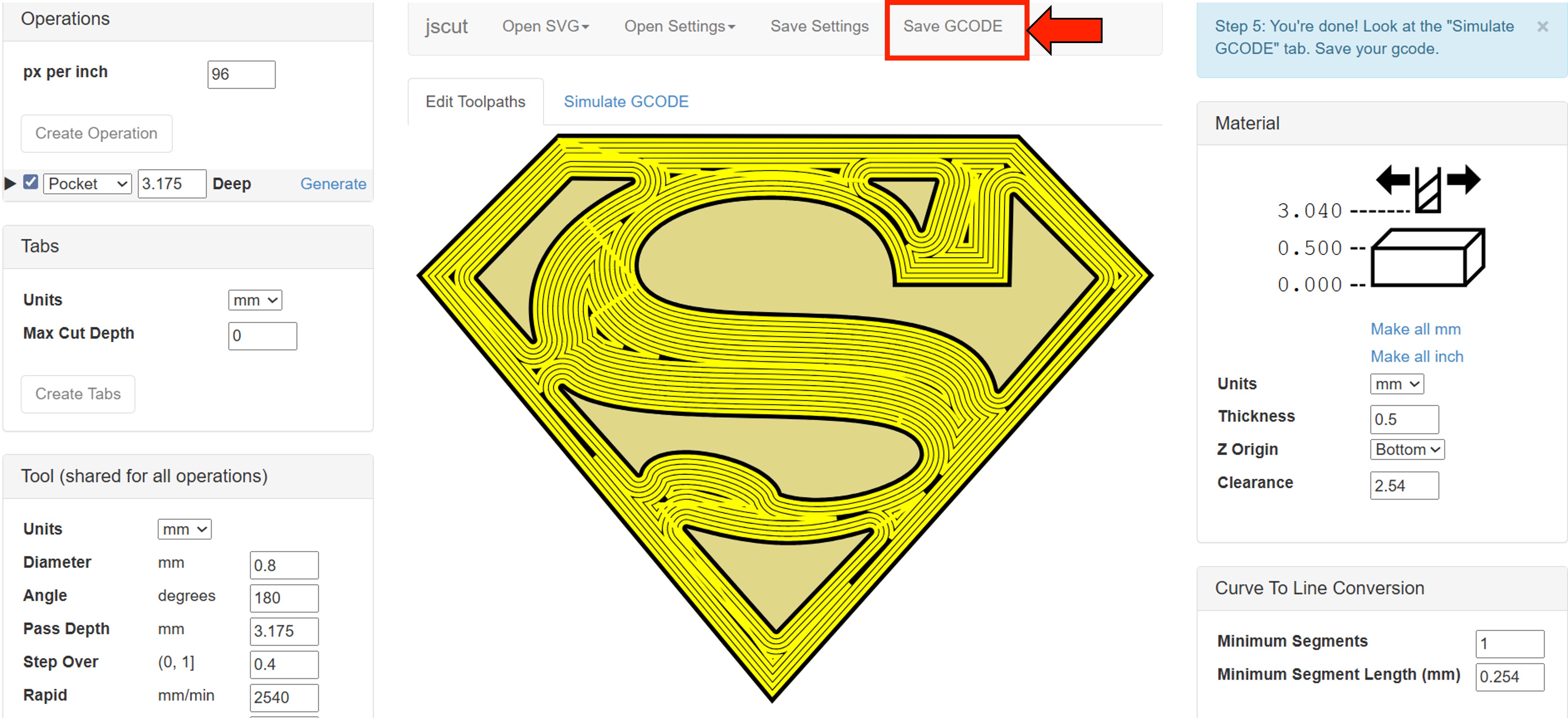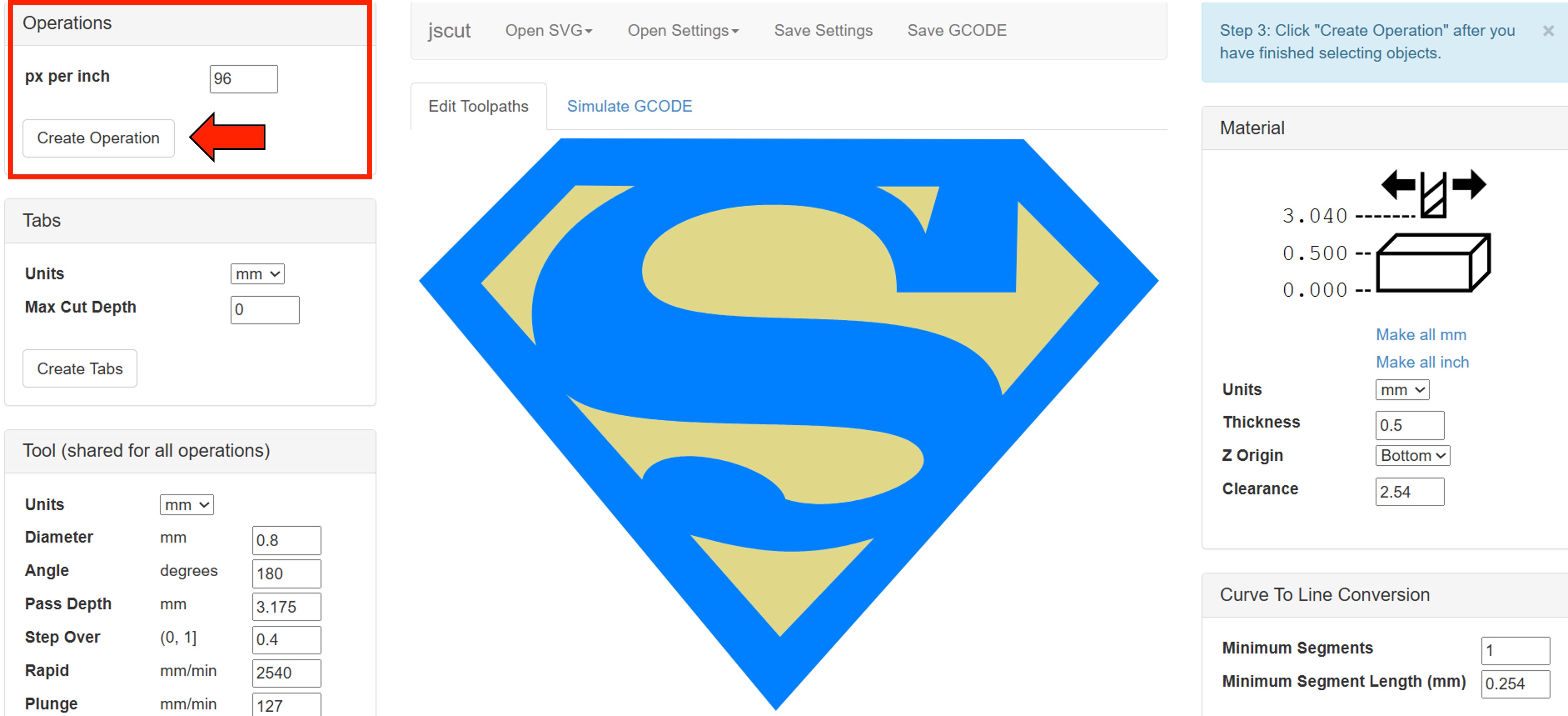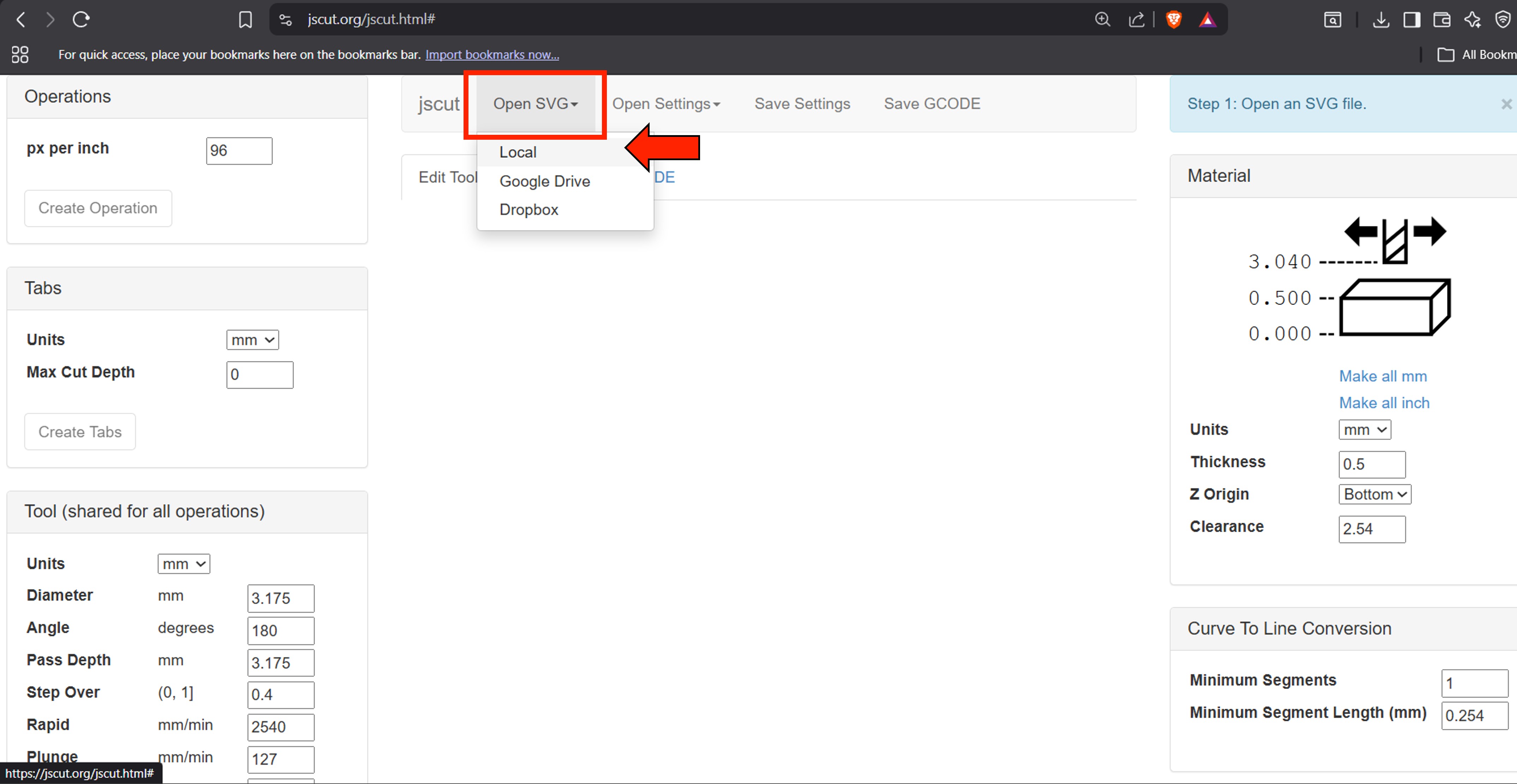 We then navigated to the JsCut website and uploaded the SVG file. In the material section, we set the parameters as shown in the image below.