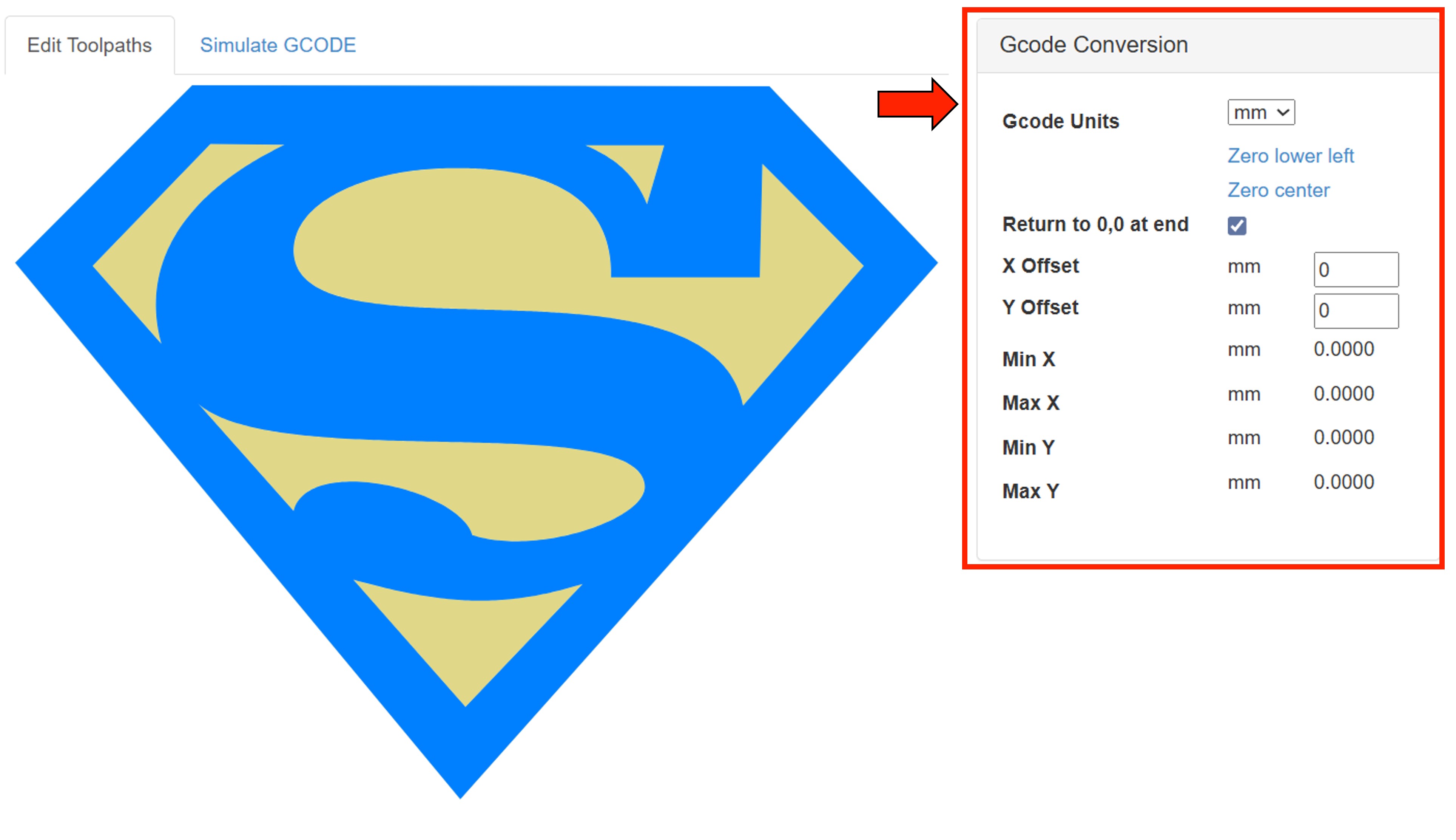 In the Gcode Conversion section, we need to active the option Return to 0,0 at end.
