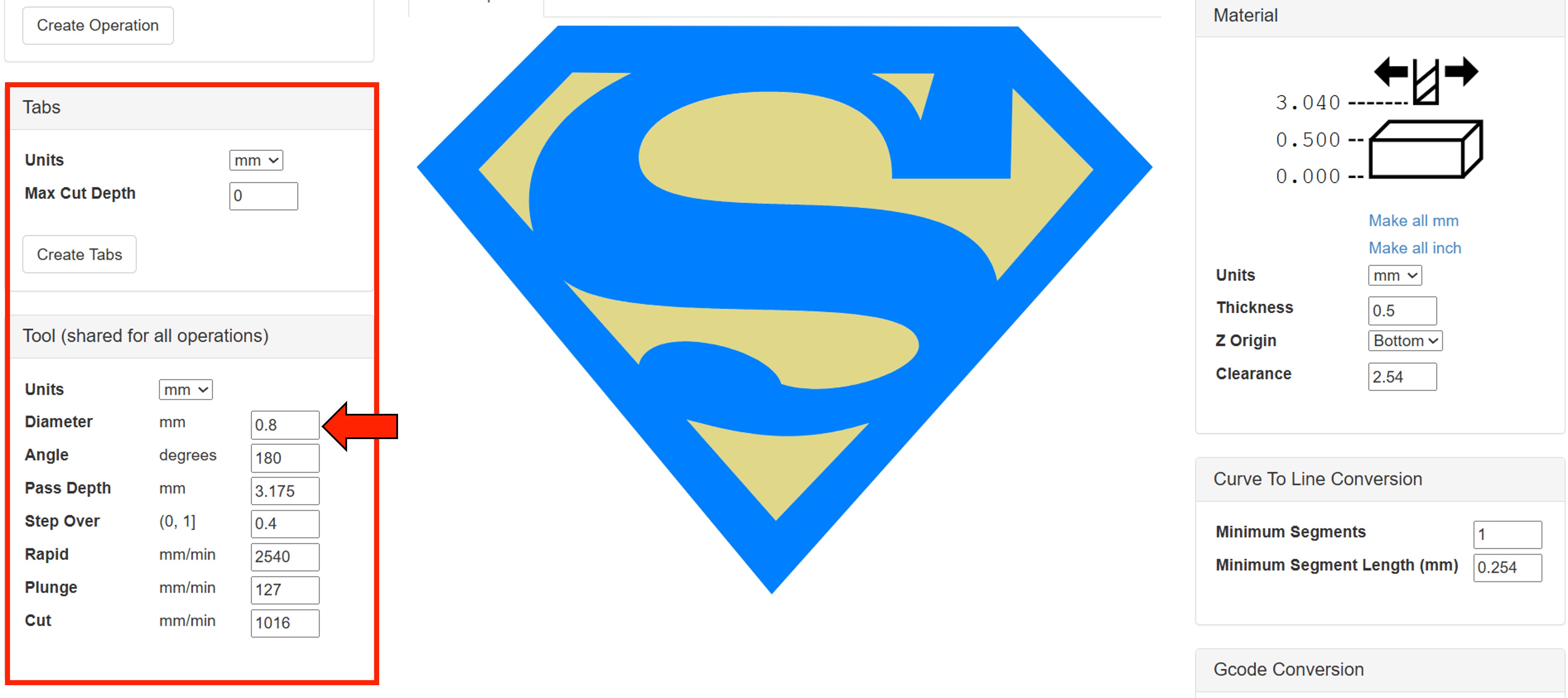 In the Tool section, we need to set the diameter to match the pen tip diameter.