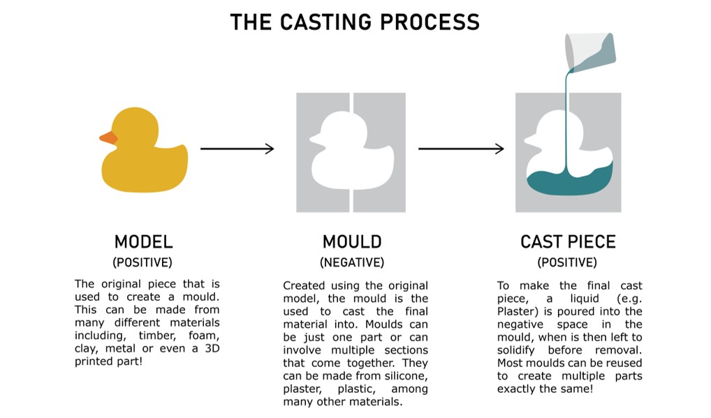 Casting: pouring a material into that mold to create a copy.