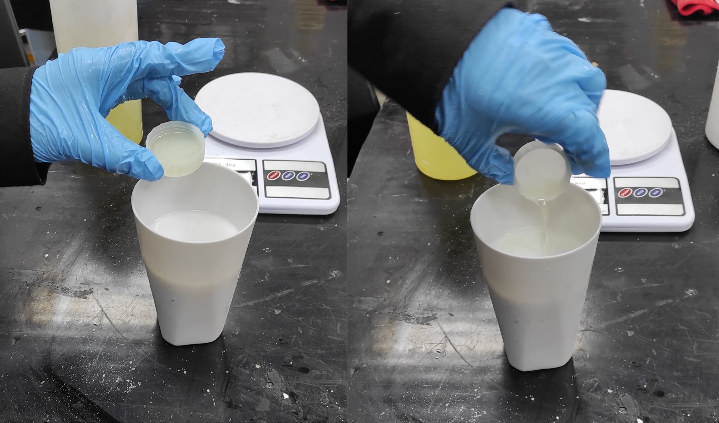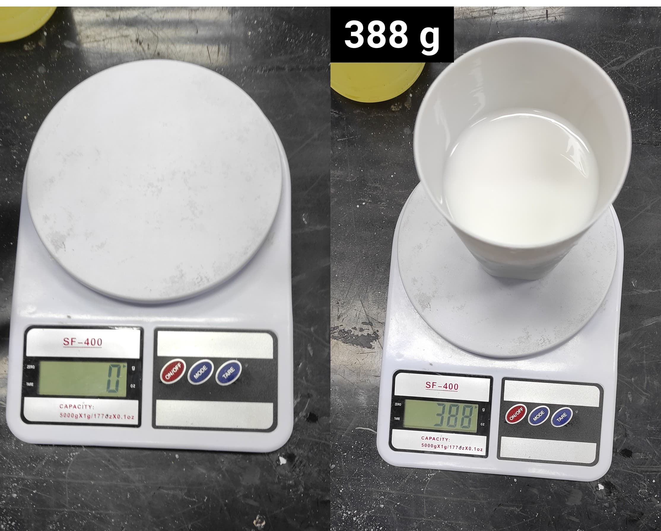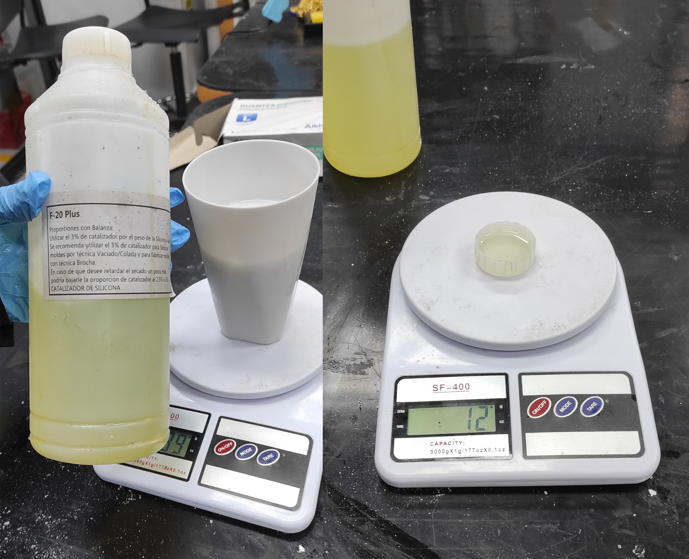 I used a balance to measure the correct proportion of silicone; as shown in the picture below, it weighs 388 grams.