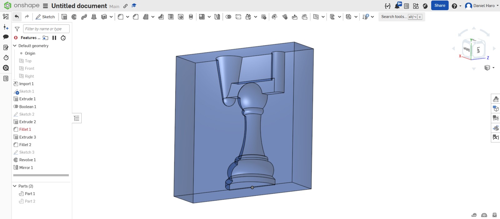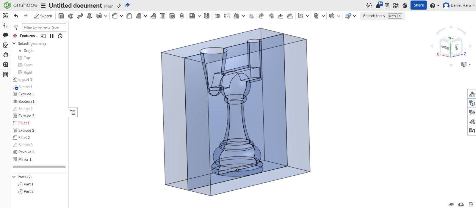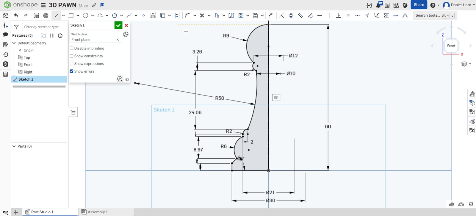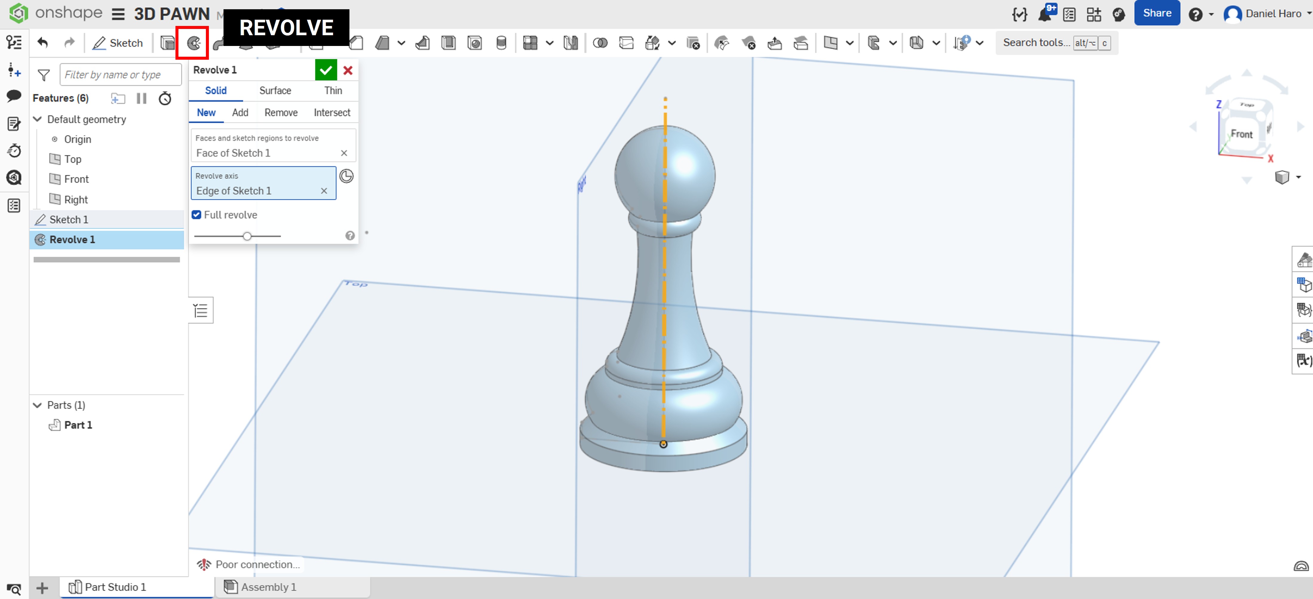 After completing the sketch, I used the revolve tool to create the pawn model.