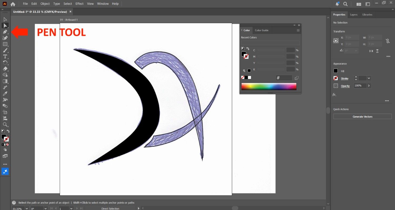 First, after sketching my logo on paper, I scanned it and imported it into the Illustrator workspace.