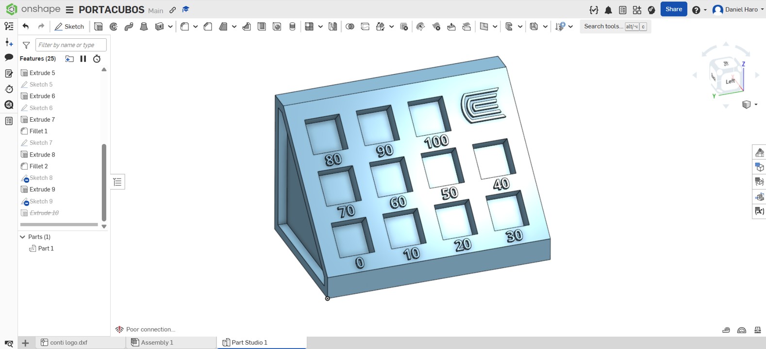 To illustrate the impact of infill in 3D printing, I created a test sample holder in Onshape. The design allows me to show infill variations from 0% all the way up to 100%.