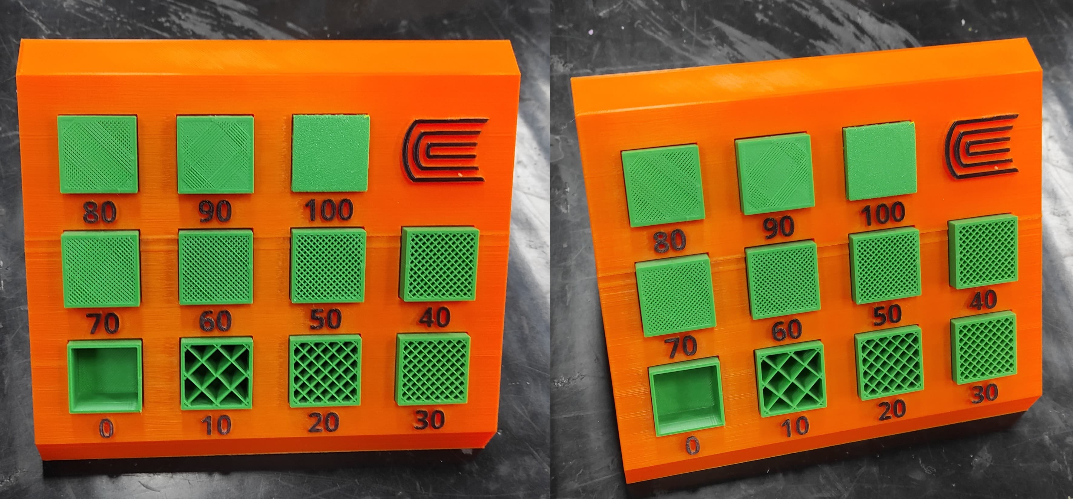 The print completed successfully, and the final result met my expectations. The infill samples, ranging from 0% to 100%, were properly positioned and clearly distinguishable.