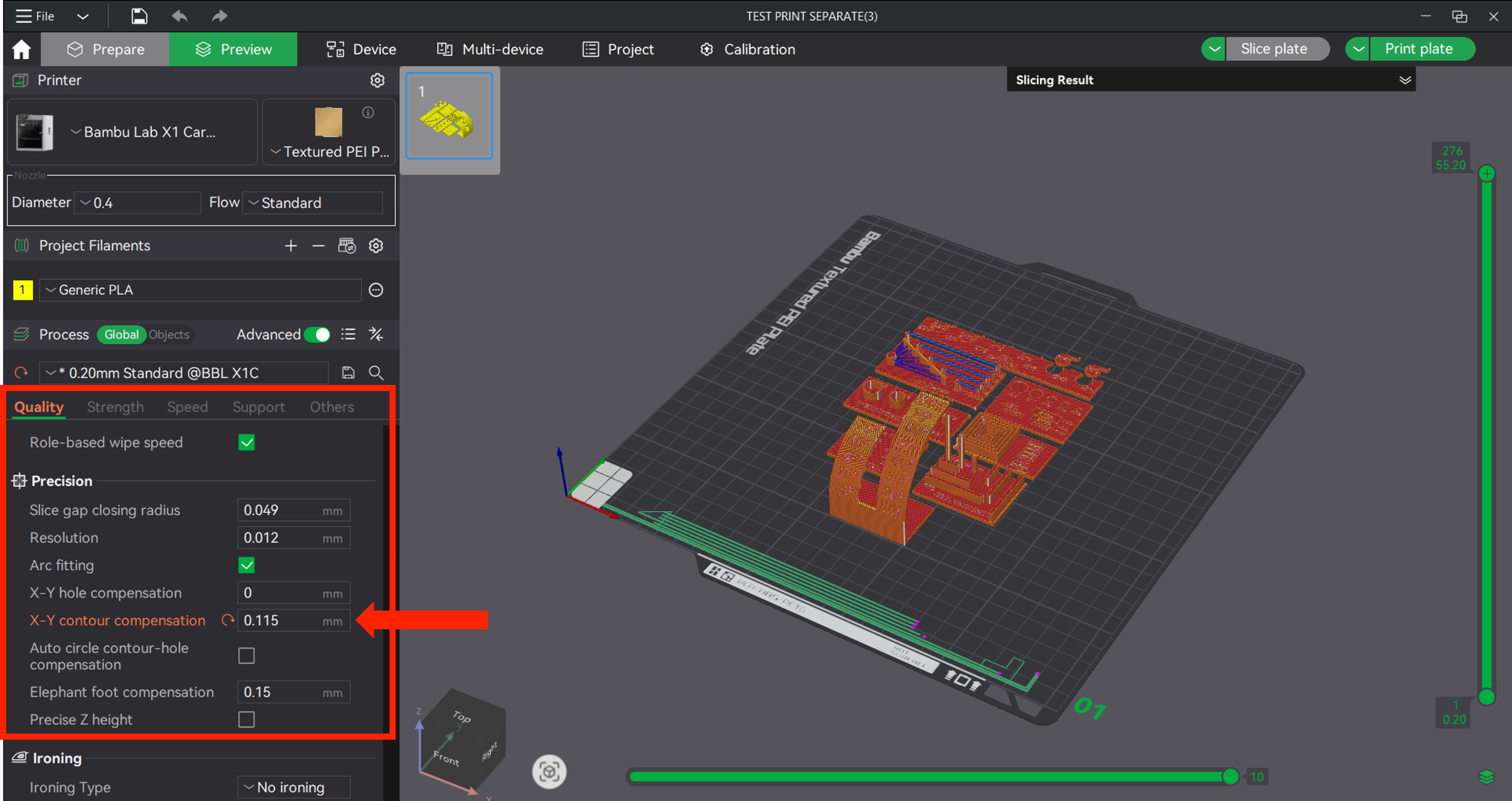 We'll apply the compensation in Bambu Studio using the XY contour compensation feature. Because our measured part came out smaller than intended, we need to input a positive value to expand the contour. Based on our calculation, we'll set it to +0.155 mm.