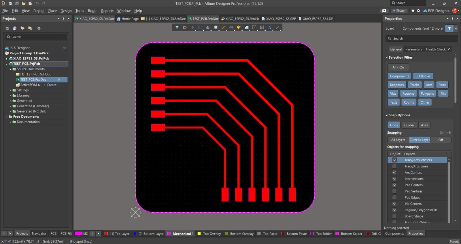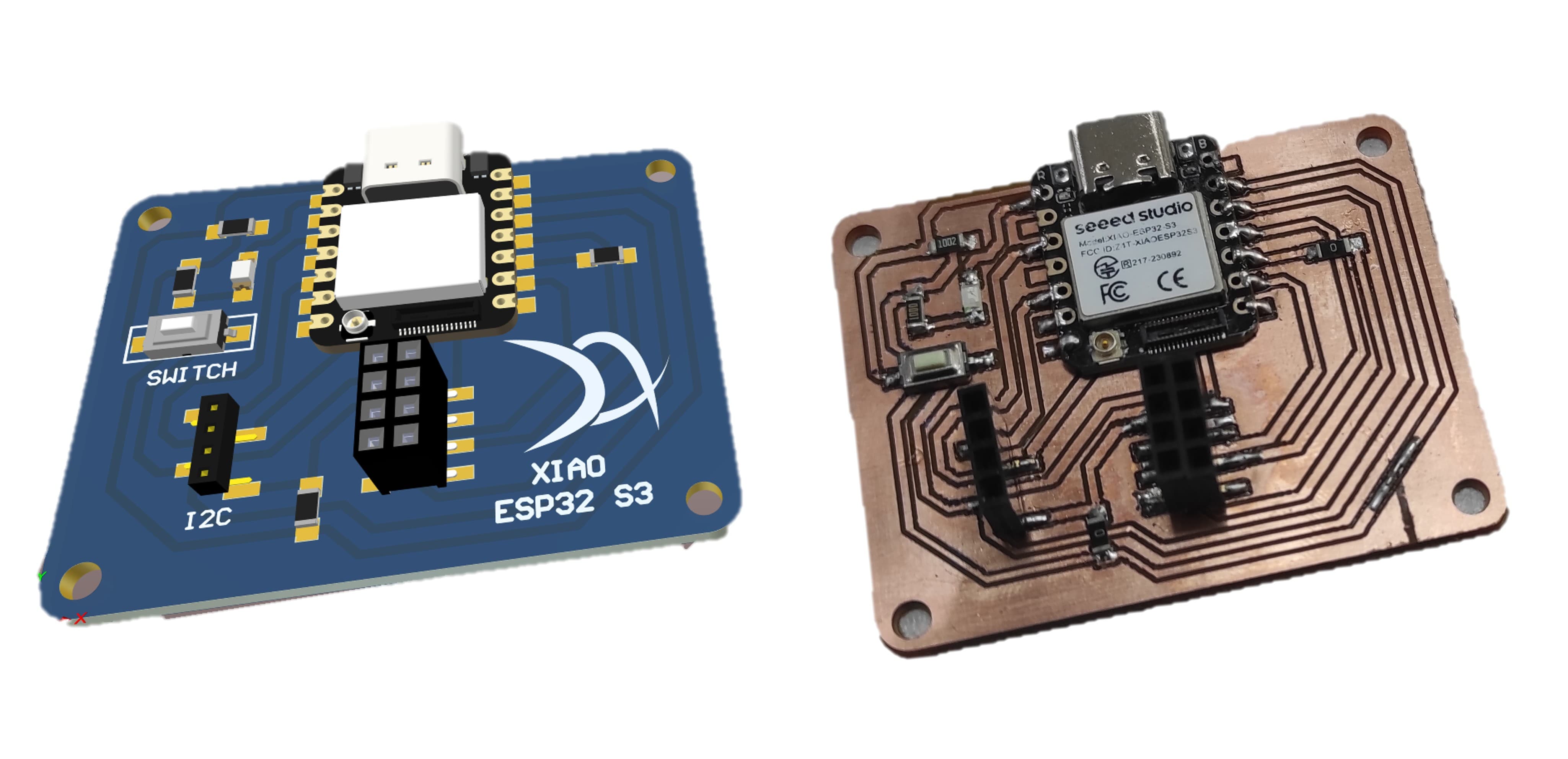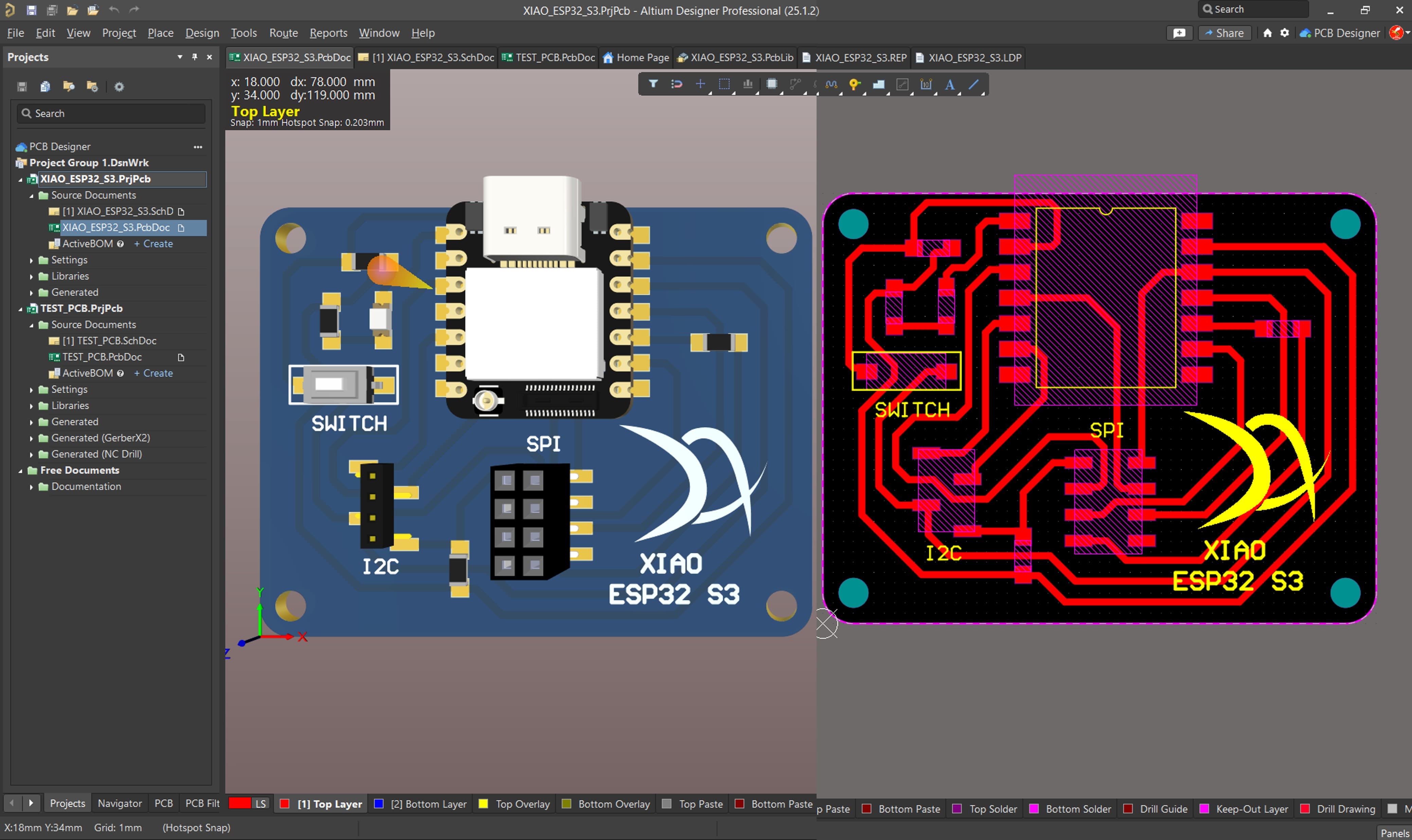 The PCB board that we are going to manufacture will work with a XIAO ESP32 S3 Sense, and will include one LED, one switch, one SPI port, and one I2C port.