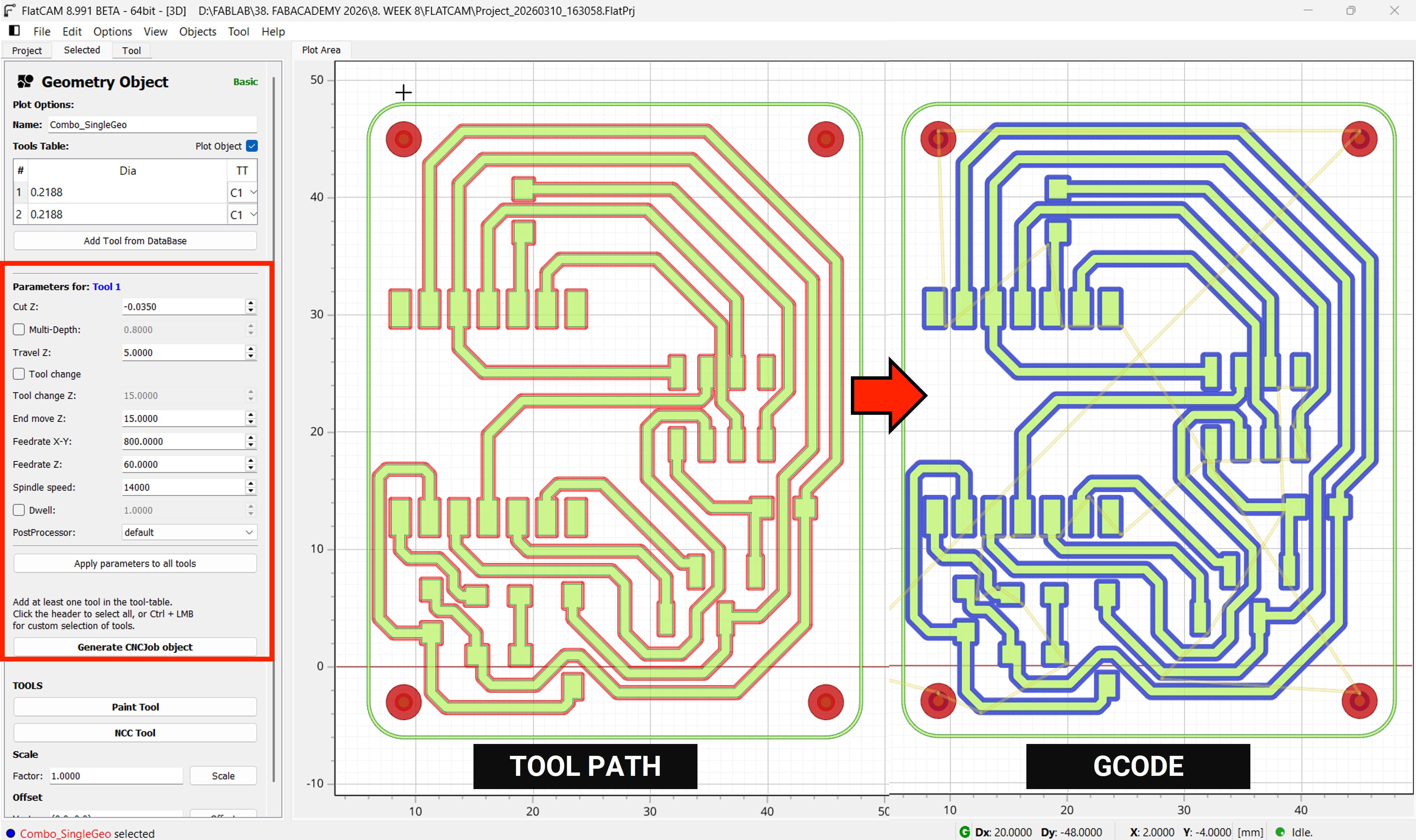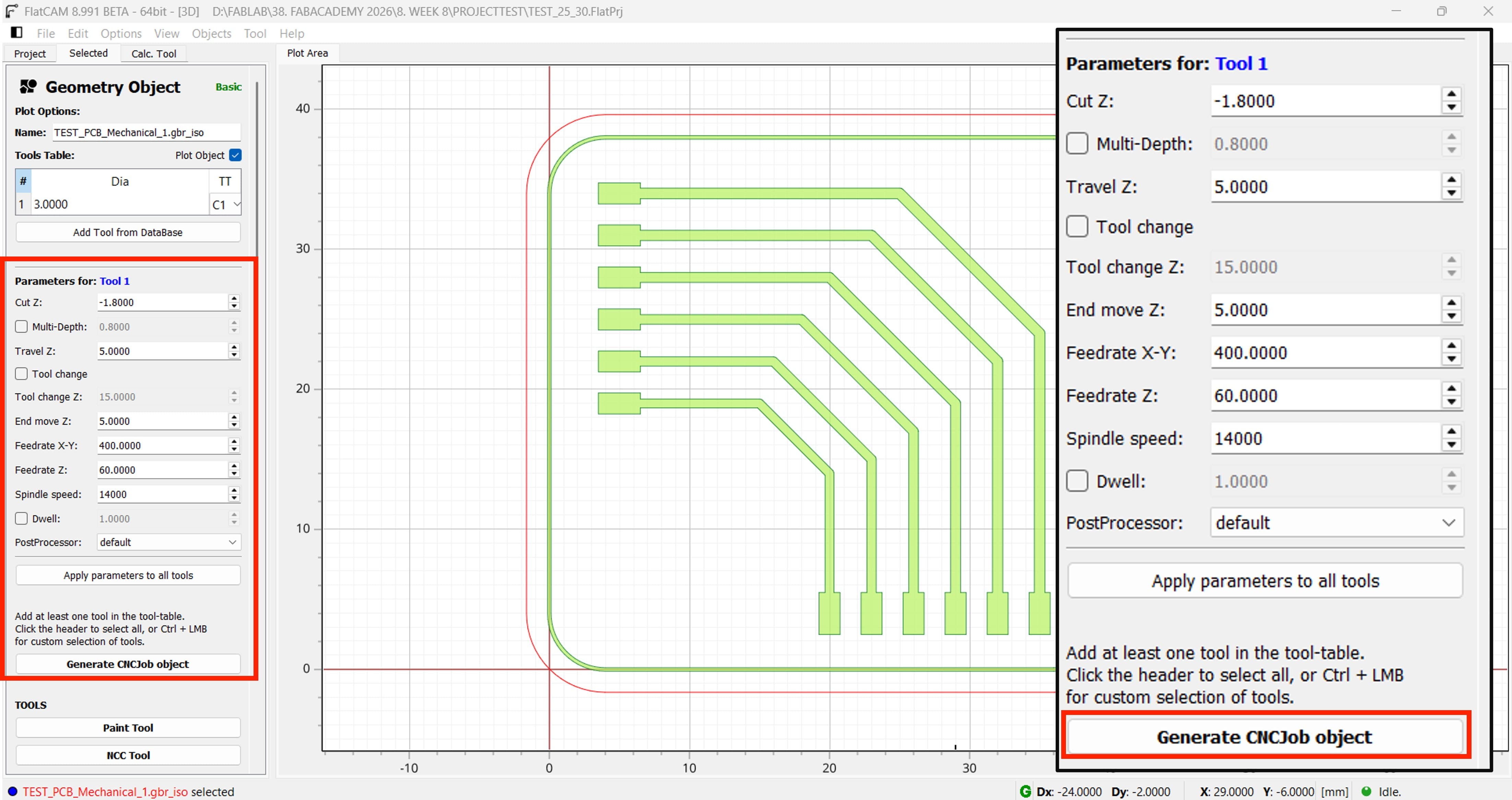When you click Generate CNCJob Object in FlatCAM, the software converts the geometry toolpaths into machine instructions (G-code) that the CNC machine can execute.