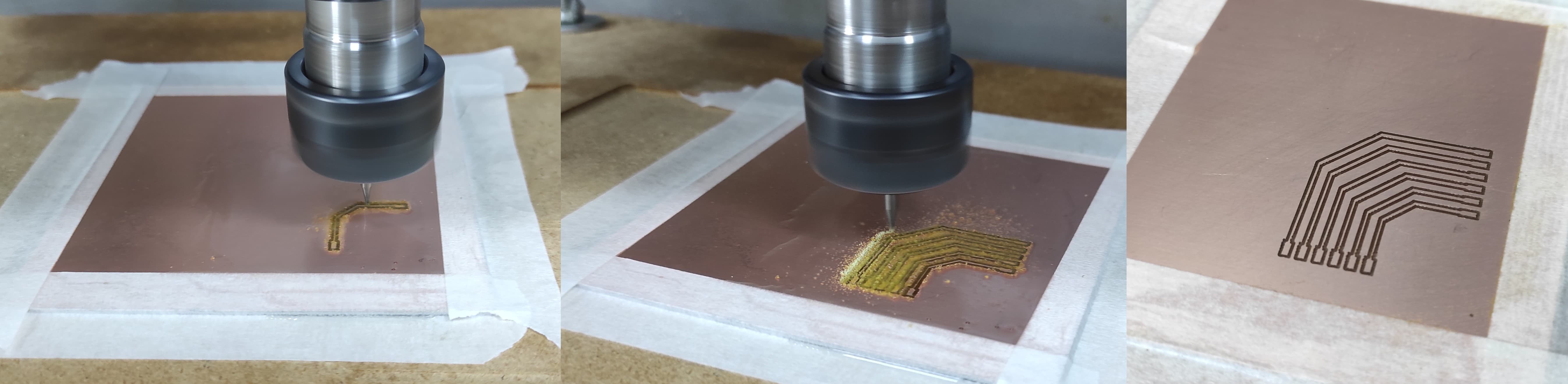 First, we mill the traces on the top copper layer using a 0.2188 mm diameter tool, as calculated previously in our test.