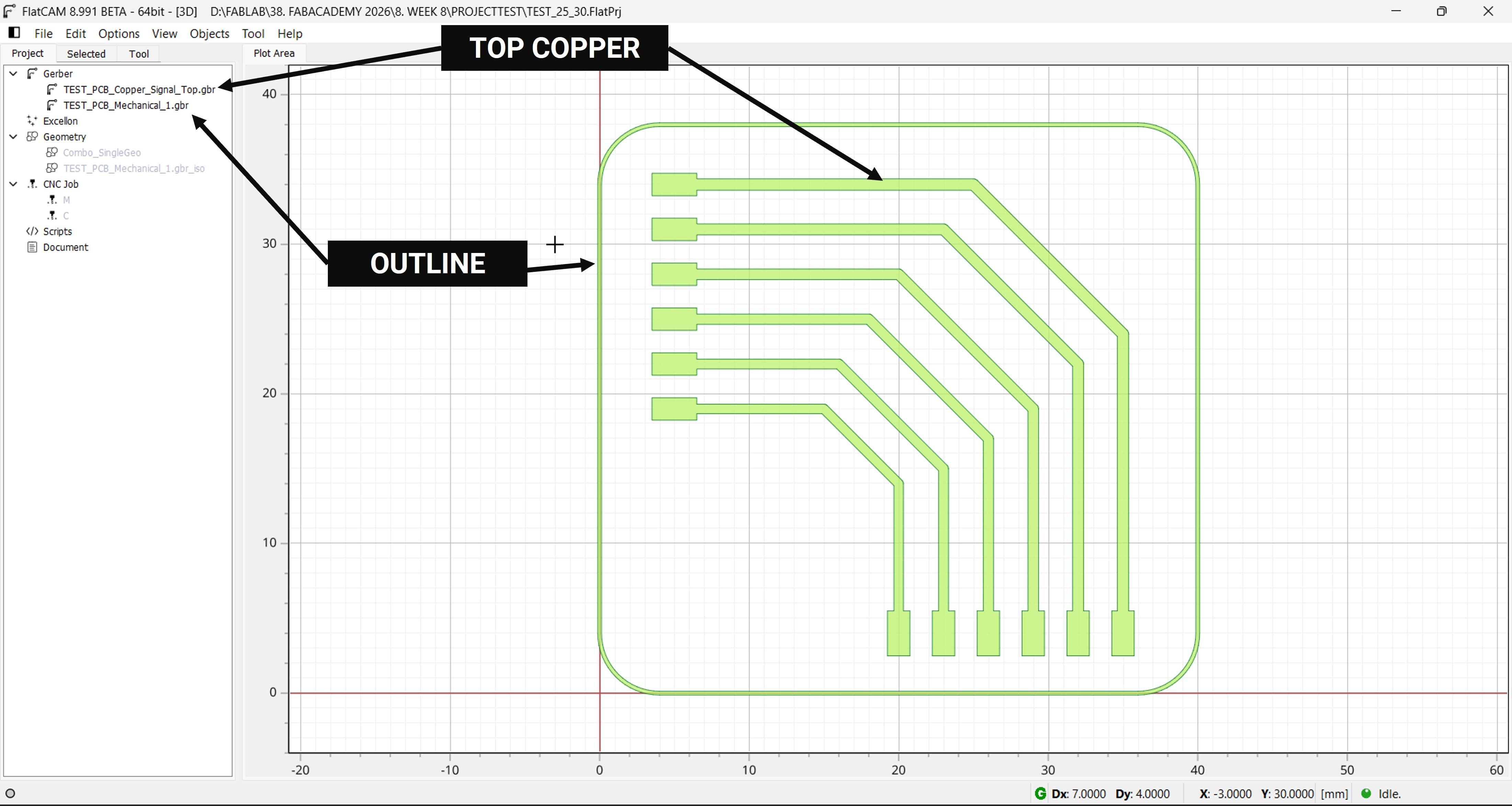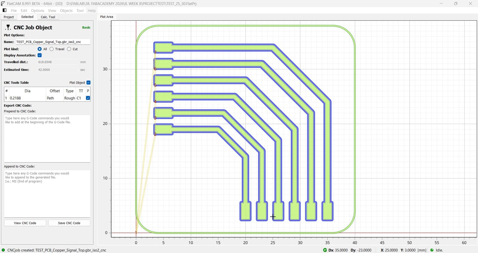 To test the milling performance of the CNC router for PCB fabrication, I created a test file with traces ranging from 20–25 mil and 25–30 mil. This test allows evaluation of the machine’s ability to accurately mill different trace widths.