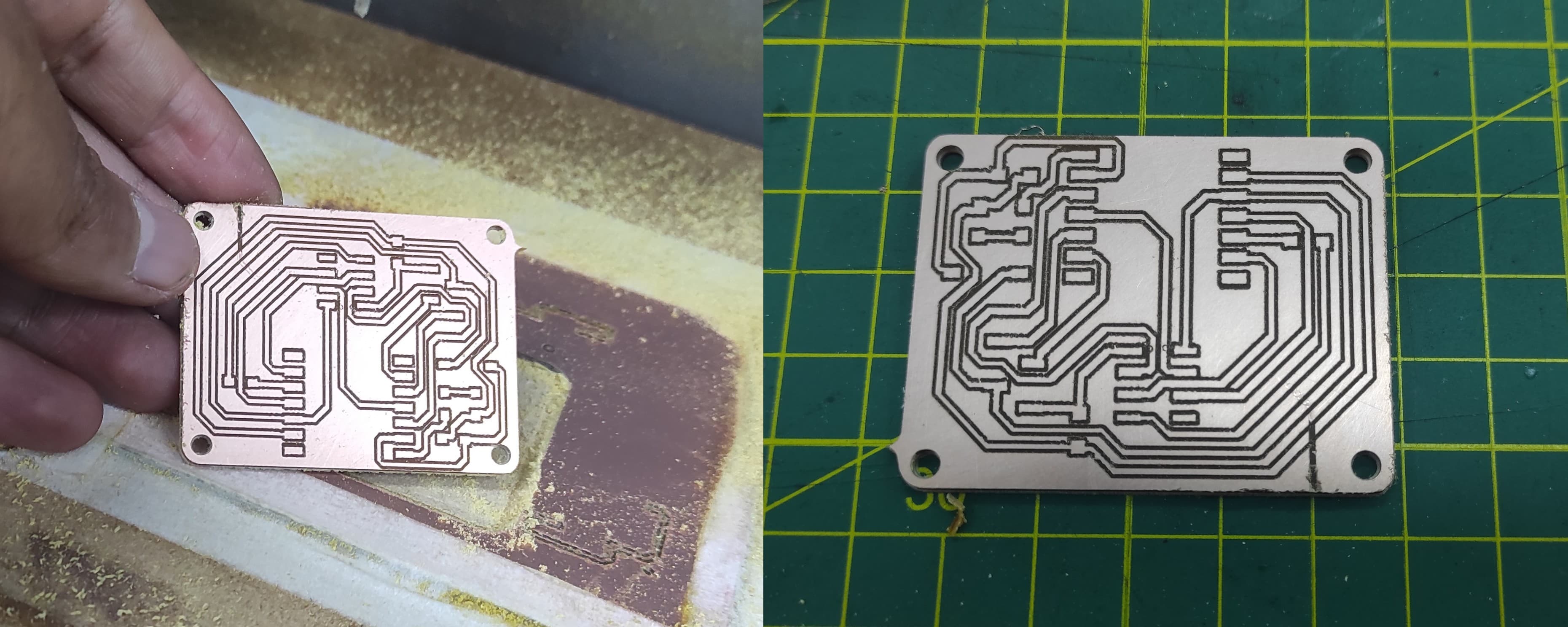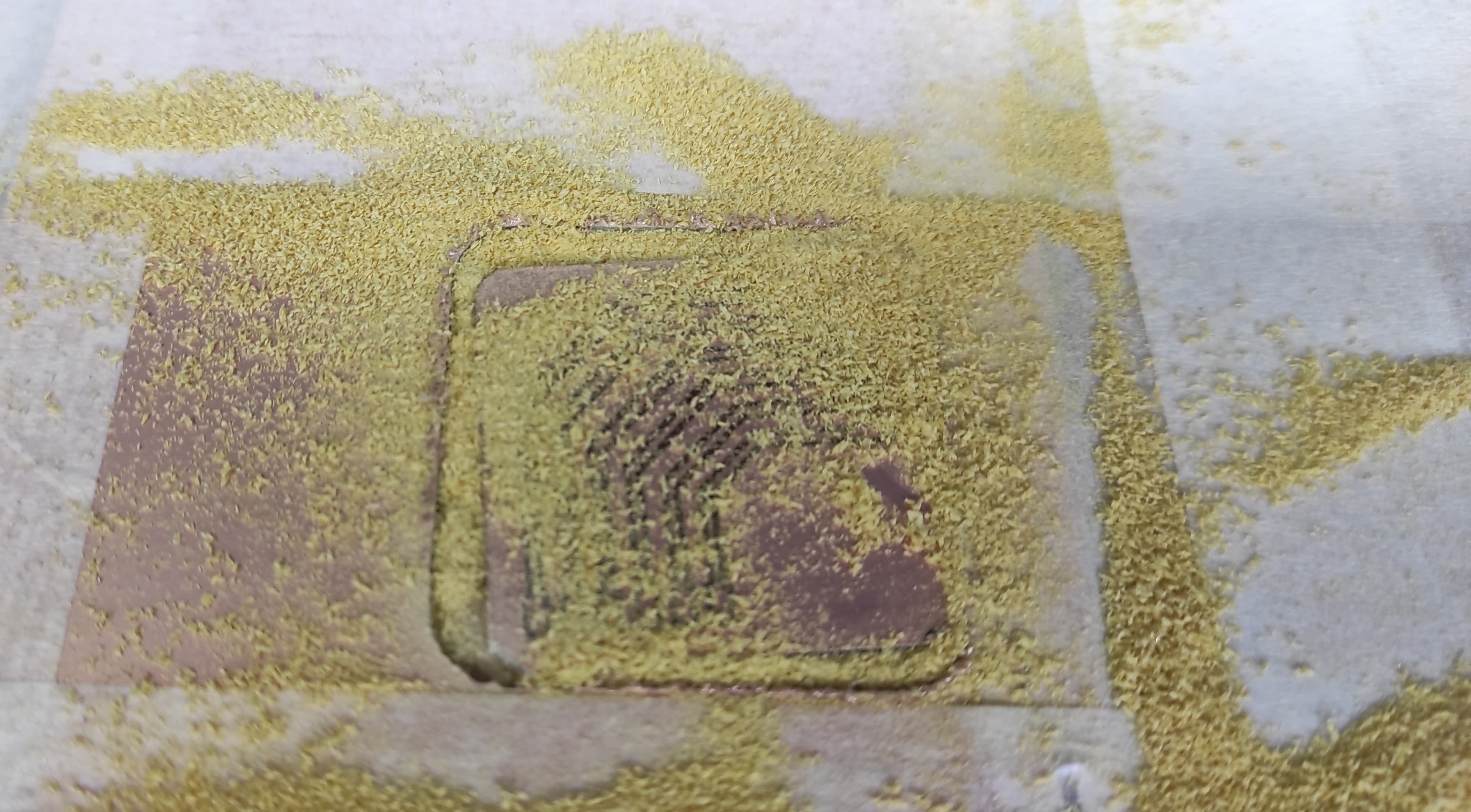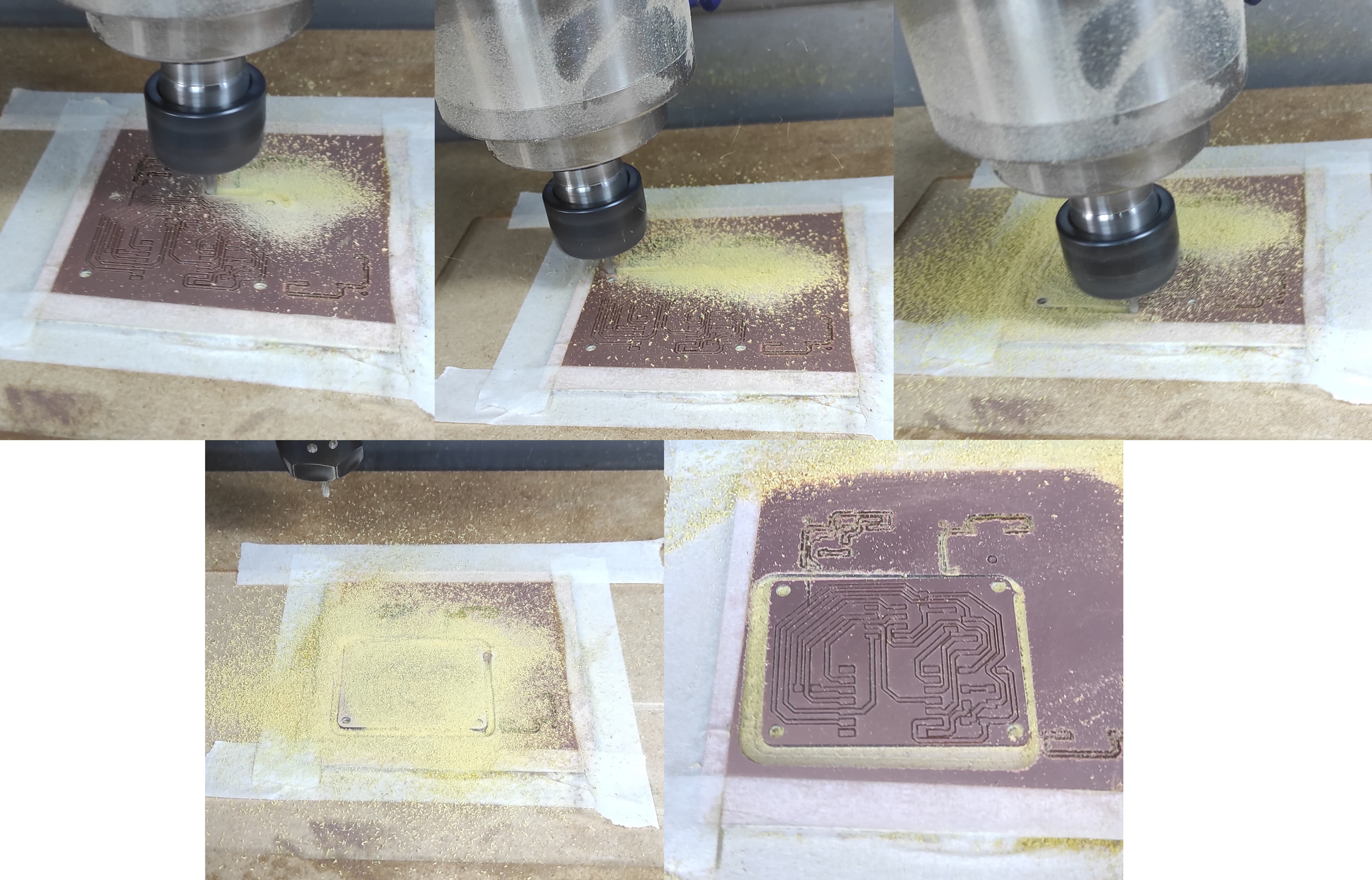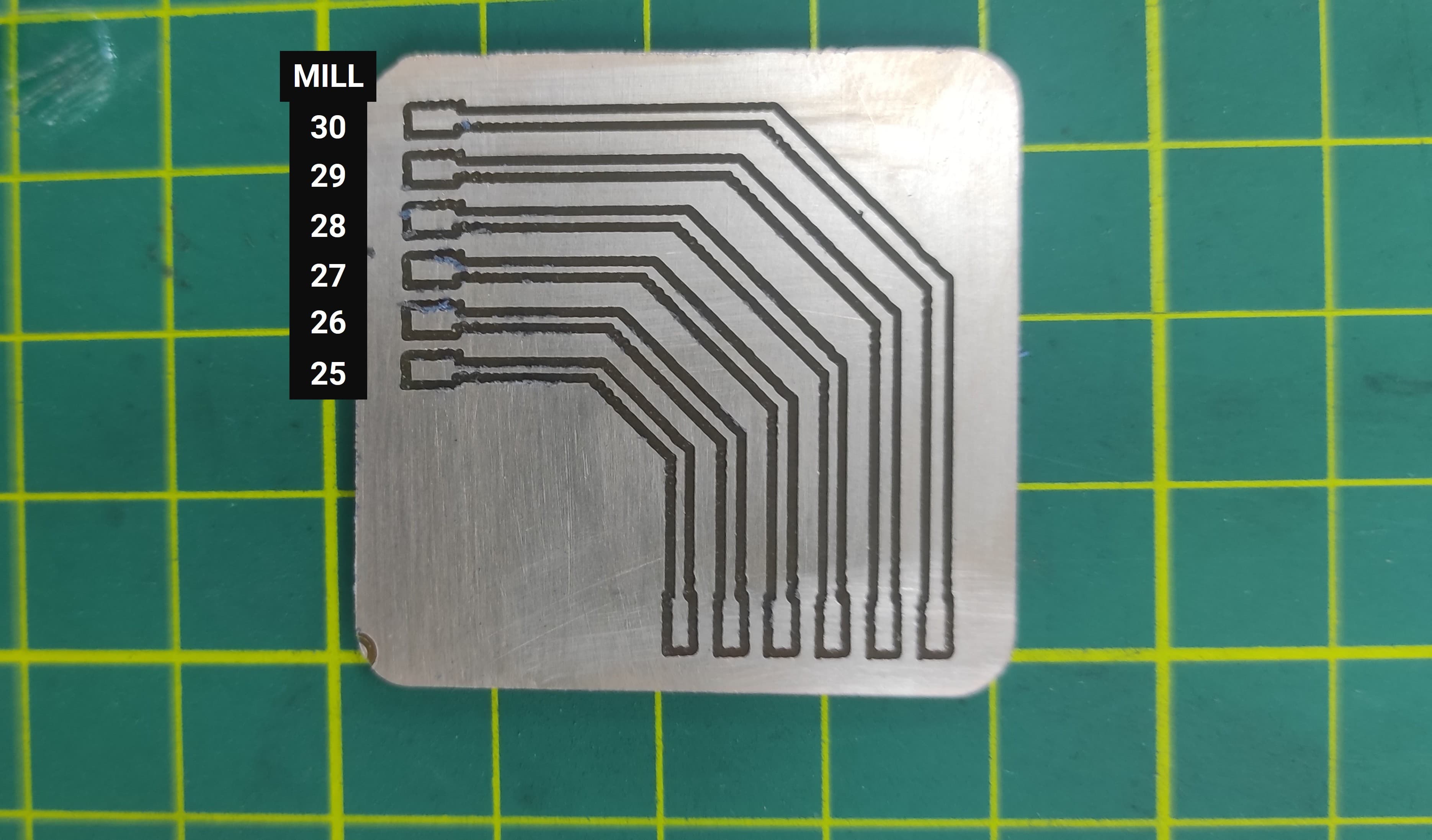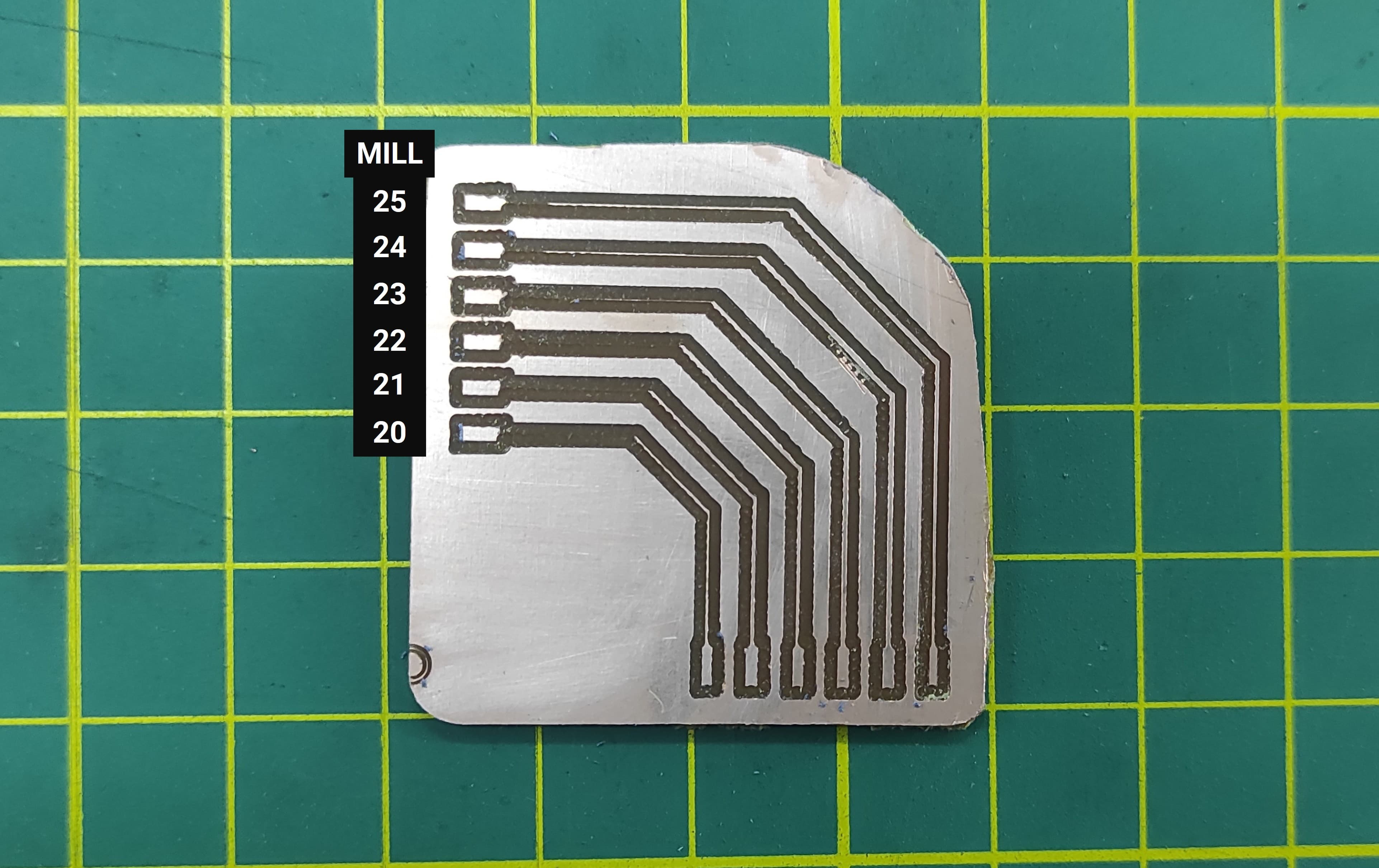In the first test with traces ranging from 20 mil to 25 mil, we observed that some areas were not milled properly. This could be due to several factors, the most important being the tool home position and possible material deformation.