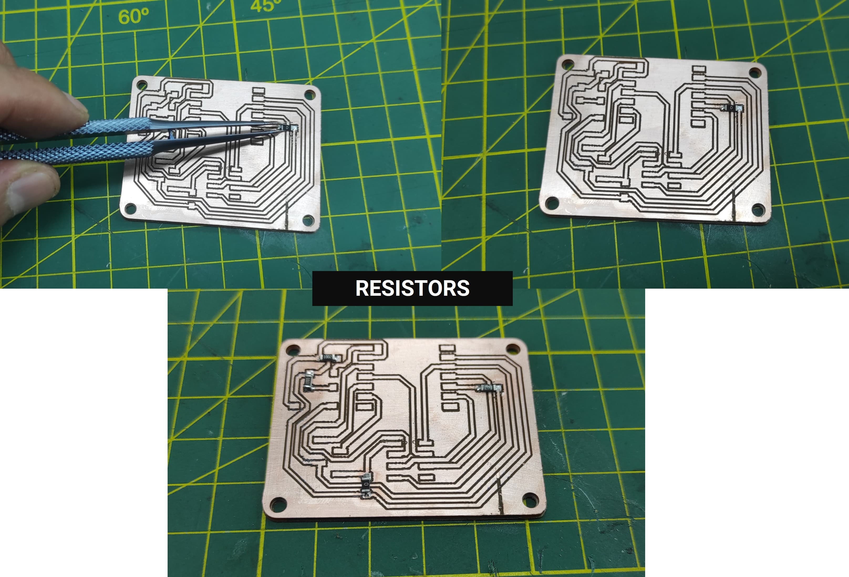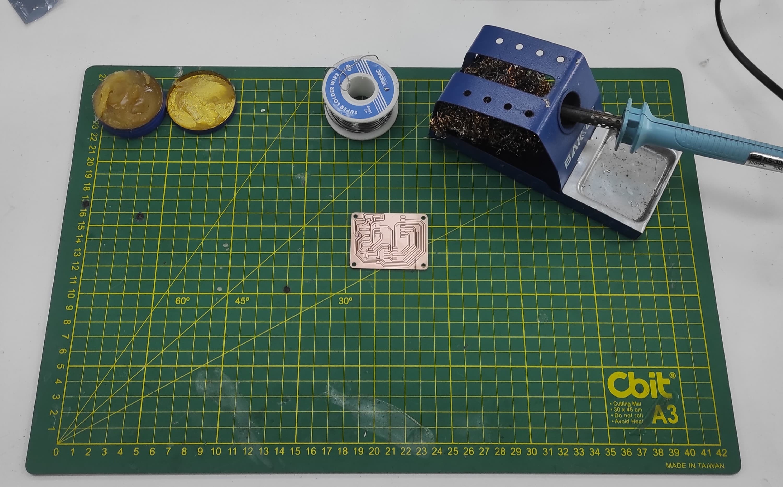 Now we will continue soldering the different components of our PCB. For this step, we need a soldering iron, solder wire, flux, tweezers, and the electronic components. It is important to carefully place each component in the correct position on the board and apply the right amount of solder to ensure good electrical connections. We start by soldering the smaller components first and then continue with the remaining parts.