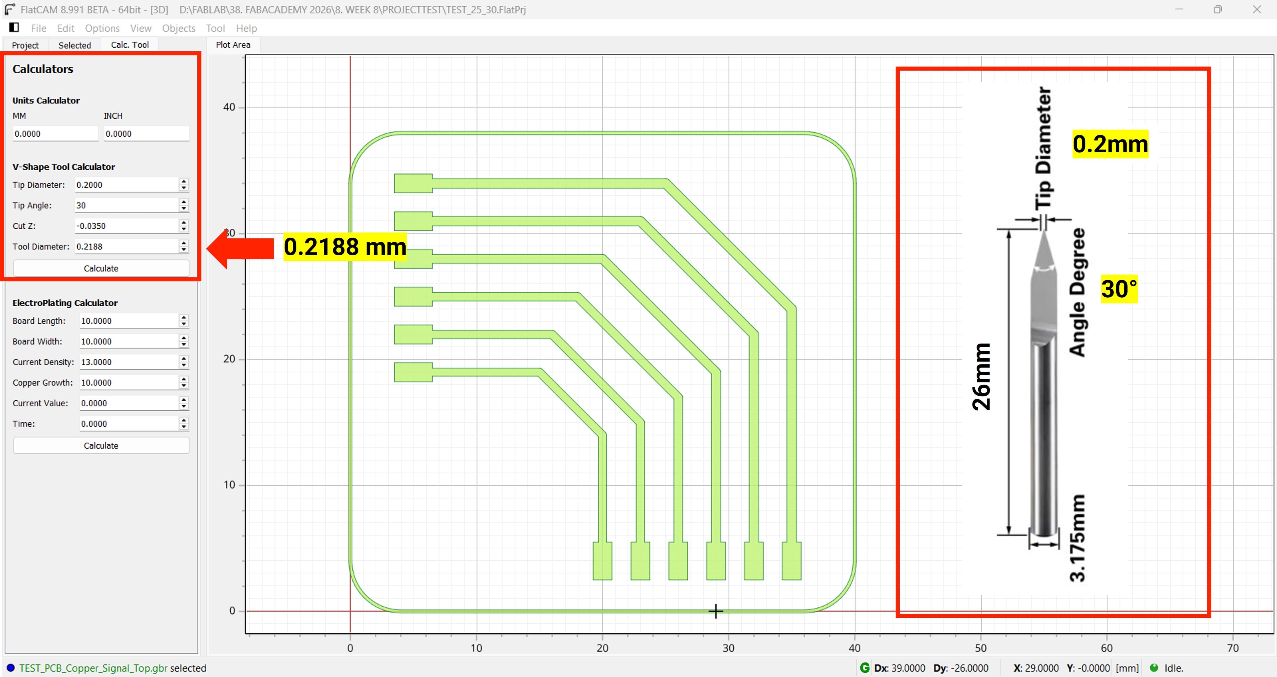 First, we need to calculate the effective tool diameter. For this, we use the calculator available in FlatCAM.
