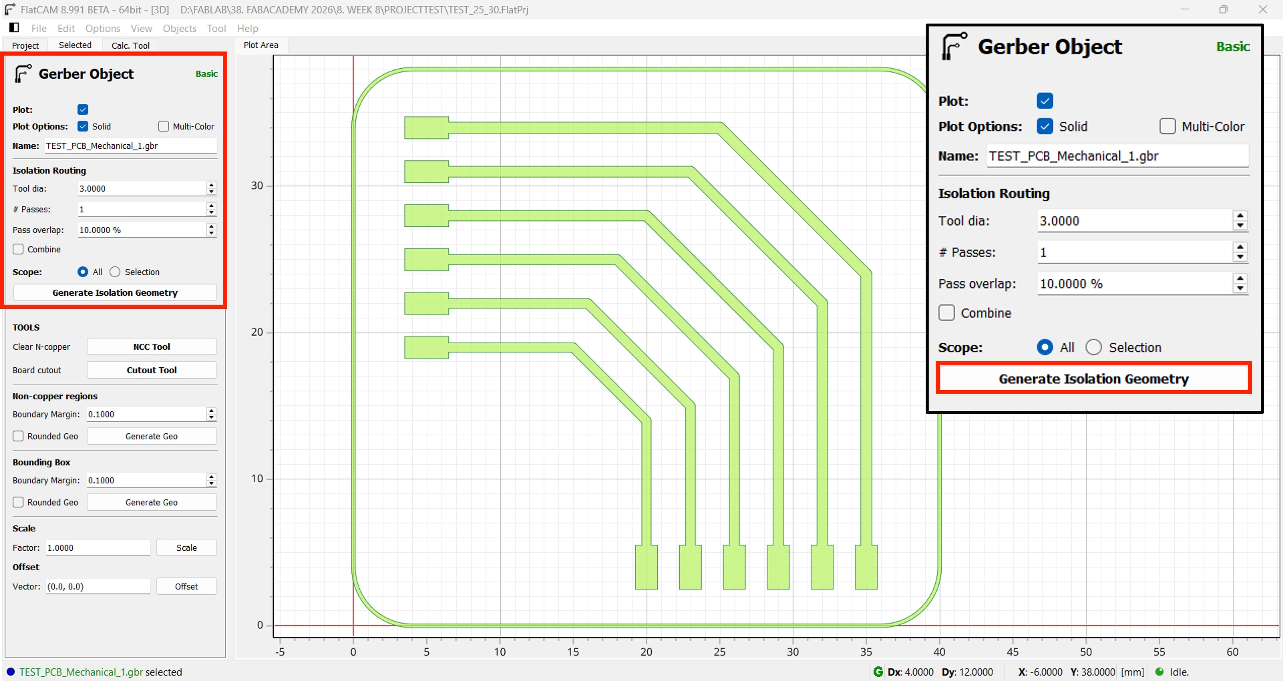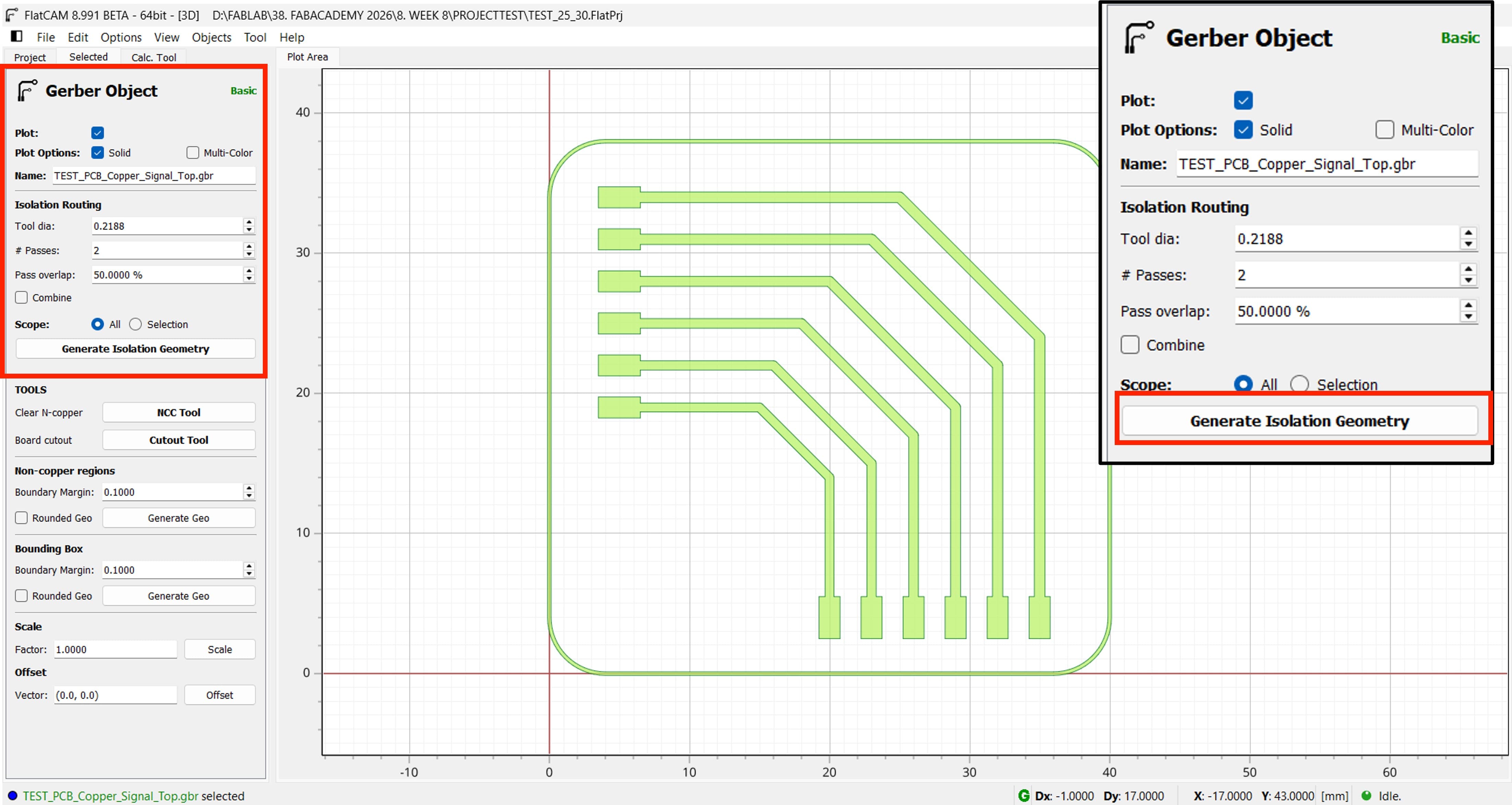 After clicking Generate Isolation Geometry in FlatCAM, the software creates the toolpaths used to isolate the PCB traces from the surrounding copper.