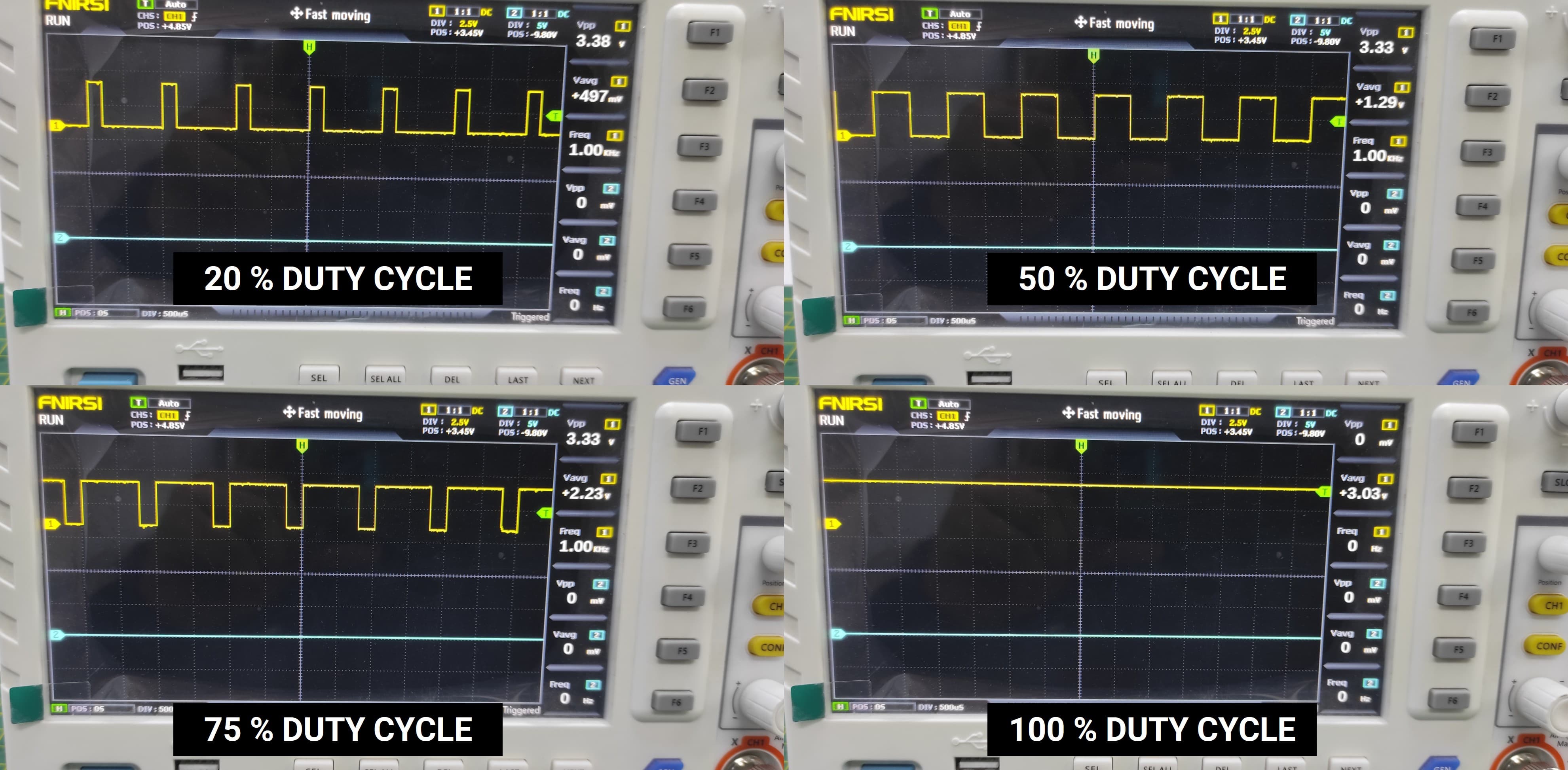 I connected the PWM signal to an oscilloscope to observe its waveform. On the oscilloscope, the signal appears as a series of square pulses that switch between a low voltage level and a high voltage level. By changing the PWM duty cycle, the width of the pulses changes while the frequency remains constant. A higher duty cycle results in wider pulses, meaning the signal stays at the high level for a longer time. This observation helps to clearly visualize how PWM controls the effective power delivered to a device such as an LED.