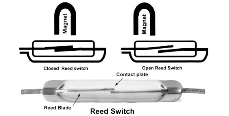 A reed switch is an electrical switch operated by a magnetic field, consisting of two ferromagnetic metal contacts (reeds) sealed within a small glass tube.