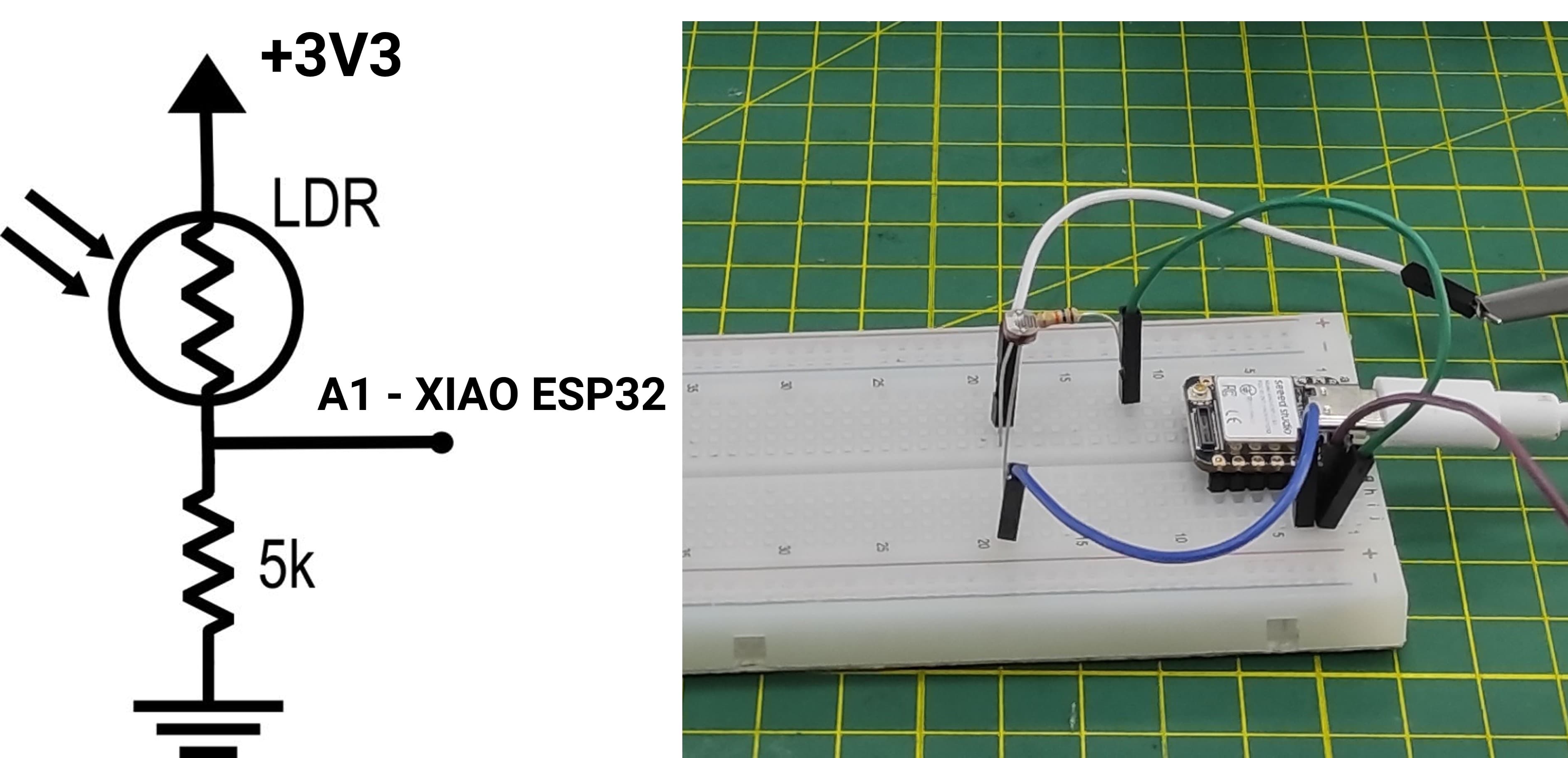 How the code works- XIAO ESP32S3 - LDR SensorThis code reads the light intensity using an LDR (light-dependent resistor) connected to an analog pin of a XIAO ESP32-S3. In the setup, it initializes serial communication and configures the ADC resolution to 12 bits, allowing readings from 0 to 4095. In the loop, it continuously reads the analog value from the LDR, converts that value into a voltage (based on a 3.3V reference), and maps it into a percentage representing light intensity. Finally, it prints the raw value, calculated voltage, and light percentage to the Serial Monitor every 500 milliseconds.