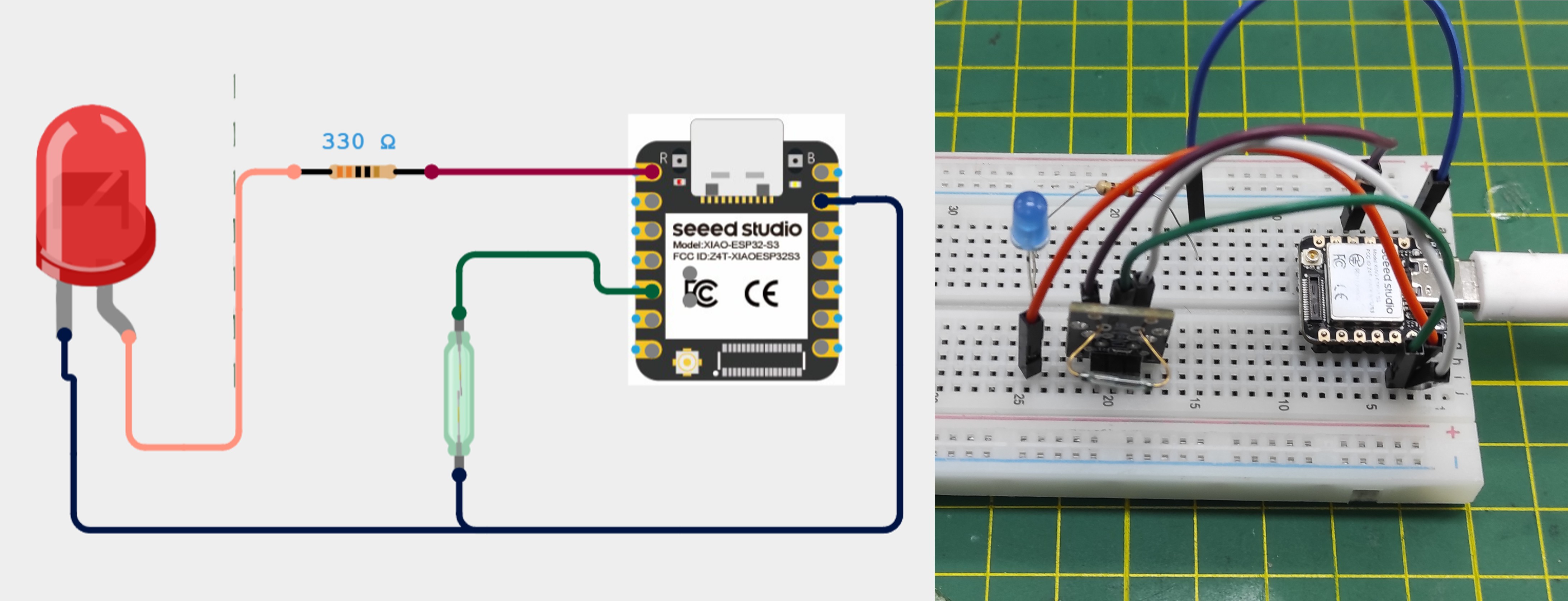 I have connected a reed switch to pin D4 and an LED (with a resistor) to pin D0 on my XIAO ESP32-S3. The circuit is programmed so that when the reed switch is activated (by a magnet), the LED turns on.