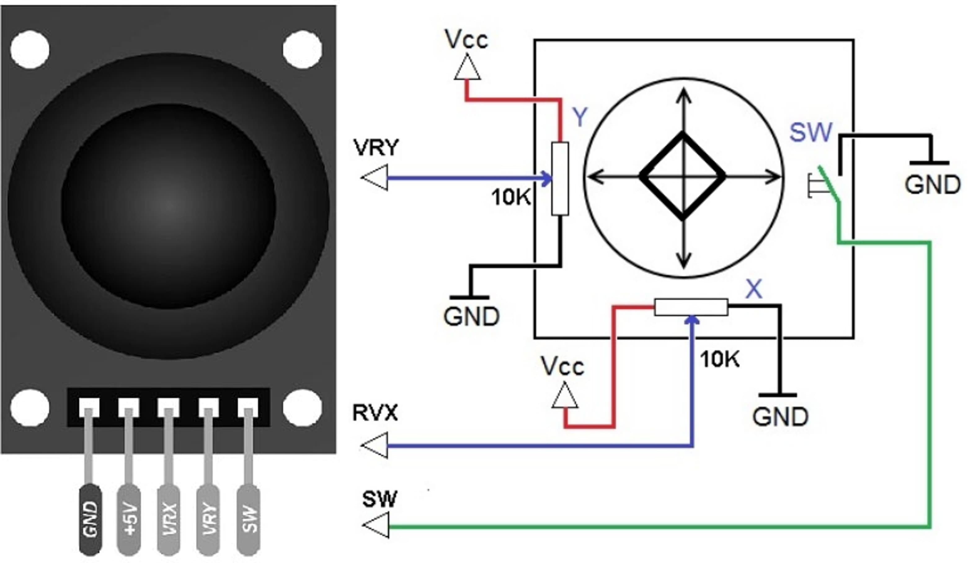 The joystick module (commonly the KY-023 model) is a two-axis analog input device (X and Y axes), similar to video game controllers, making it ideal for projects with Arduino or microcontrollers. It uses two potentiometers (10kΩ each) to detect position and has an integrated push button when pressed down.