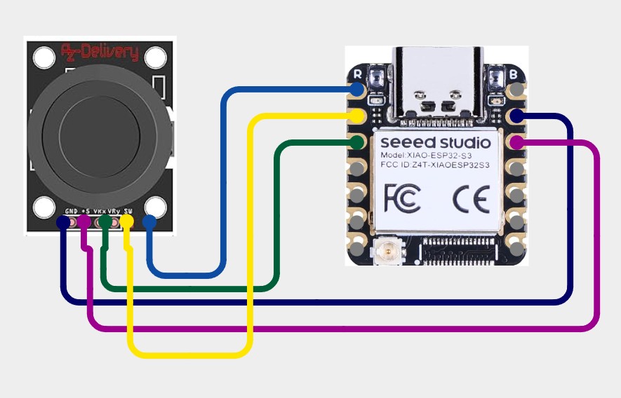 This code reads a joystick connected to a XIAO ESP32-S3 without using external libraries. It captures the X and Y axis positions using analog inputs and reads the button state using a digital pin with an internal pull-up resistor. The values are then printed to the Serial Monitor in a simple CSV format, where the button is shown as 1 when pressed and 0 when released, updating every 100 milliseconds.
