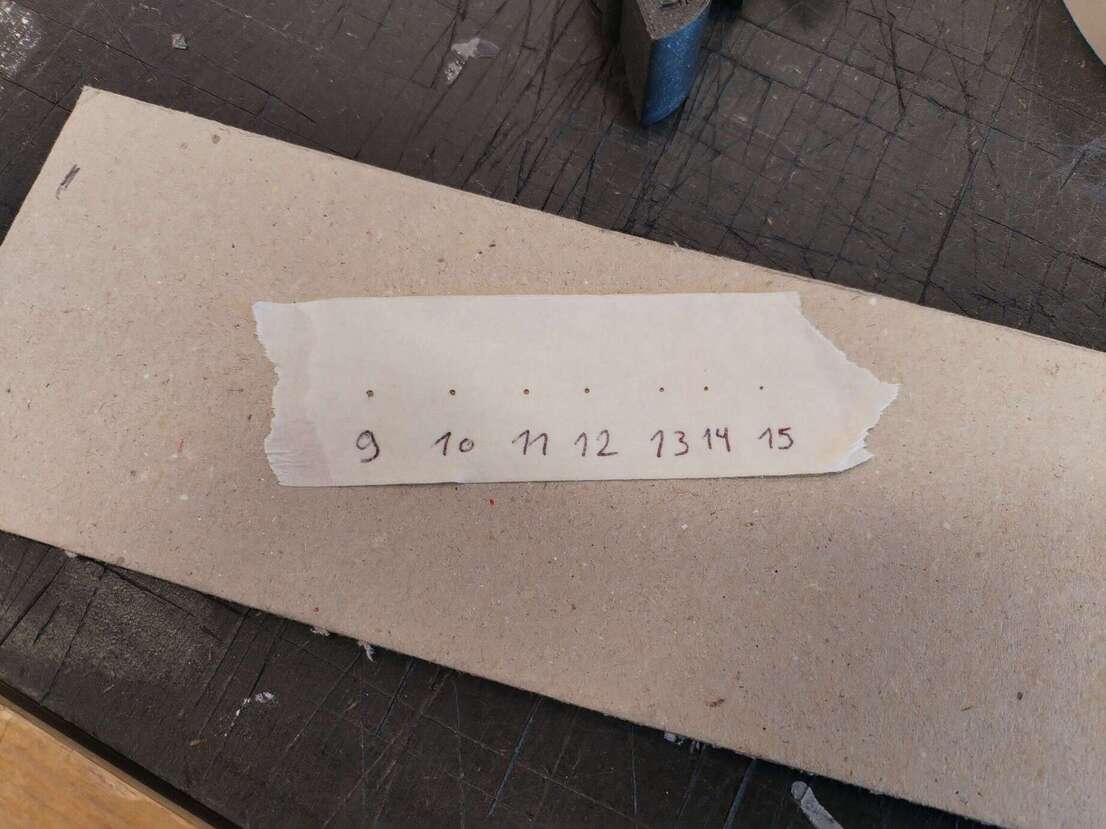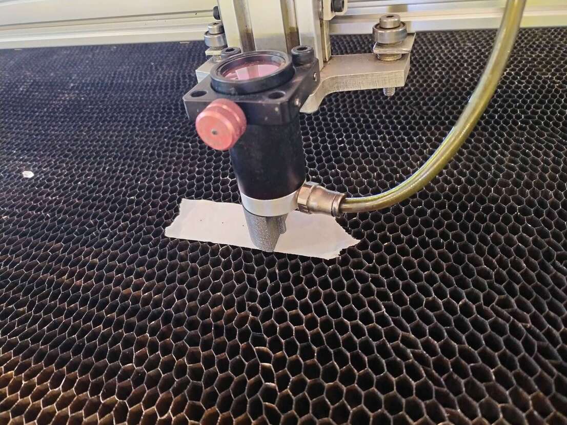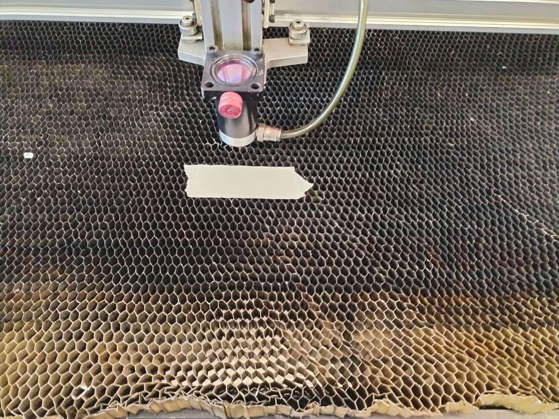 In order to adjust correctly the focus before cutting, we have to determine the focal distance of the laser cutter lens. Therefore we fixed a tape band on the work plan of the laser cutter and we will do laser pulses starting at different heights.