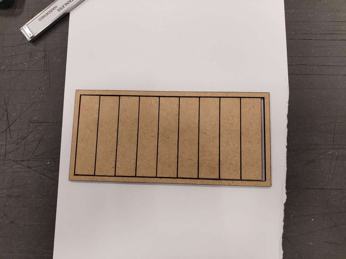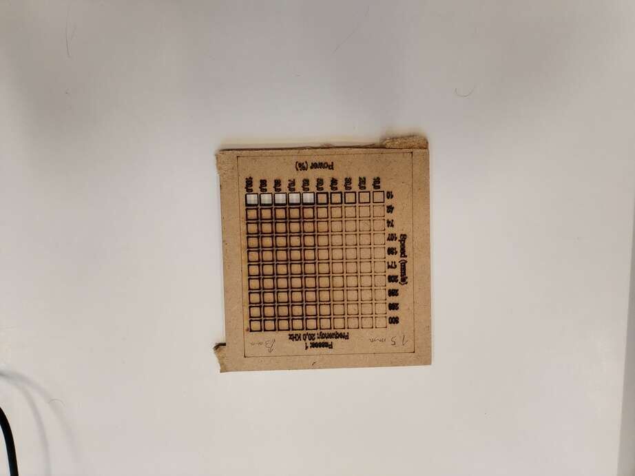 The kerf test consists in measuring the width of the cut made by the laser cutter. Indeed when the laser cut something, it removes some matter. To determine this width, we cut a large rectangle containing 9 small ones.