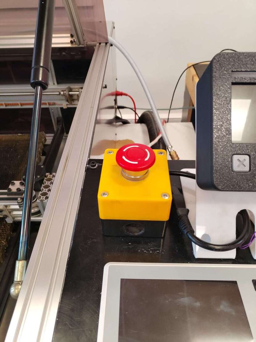 To turn it on and off we have to use the emergency button (on the left) then we have to turn on the extractor (on the right) whose role is to vaccum the harmful smokes coming out of the cut material.
