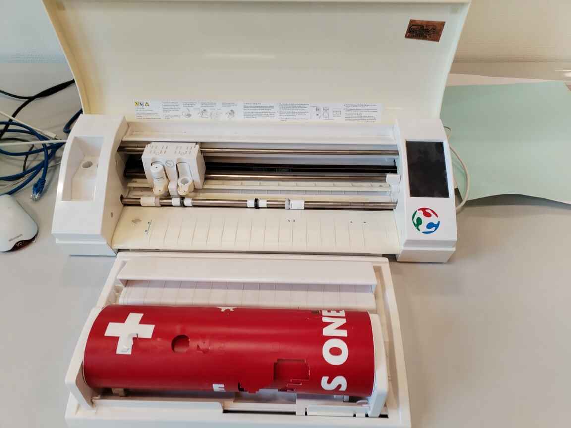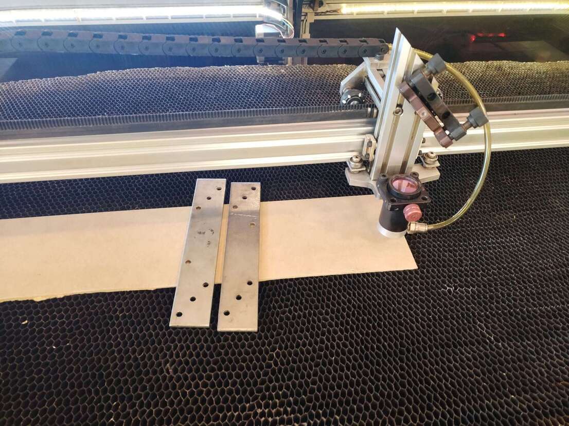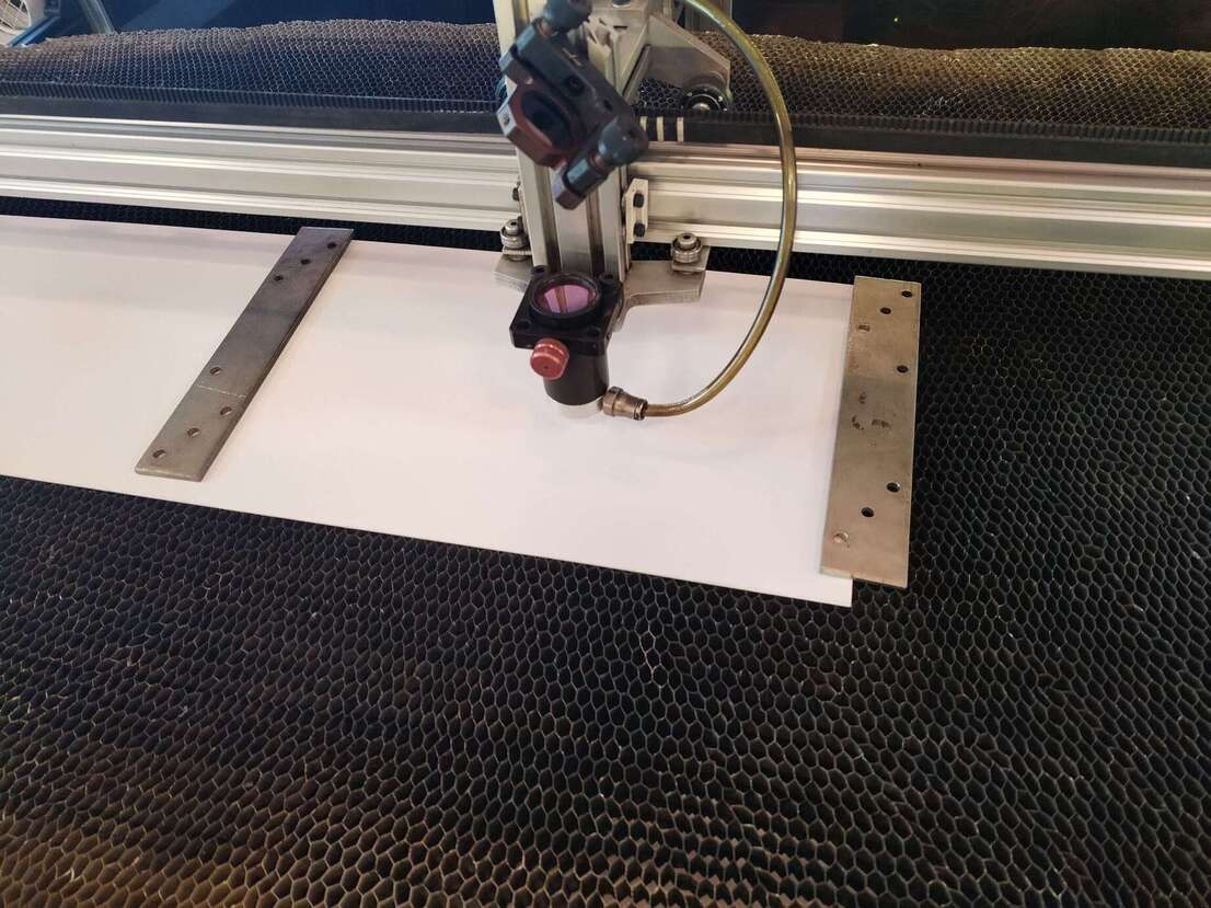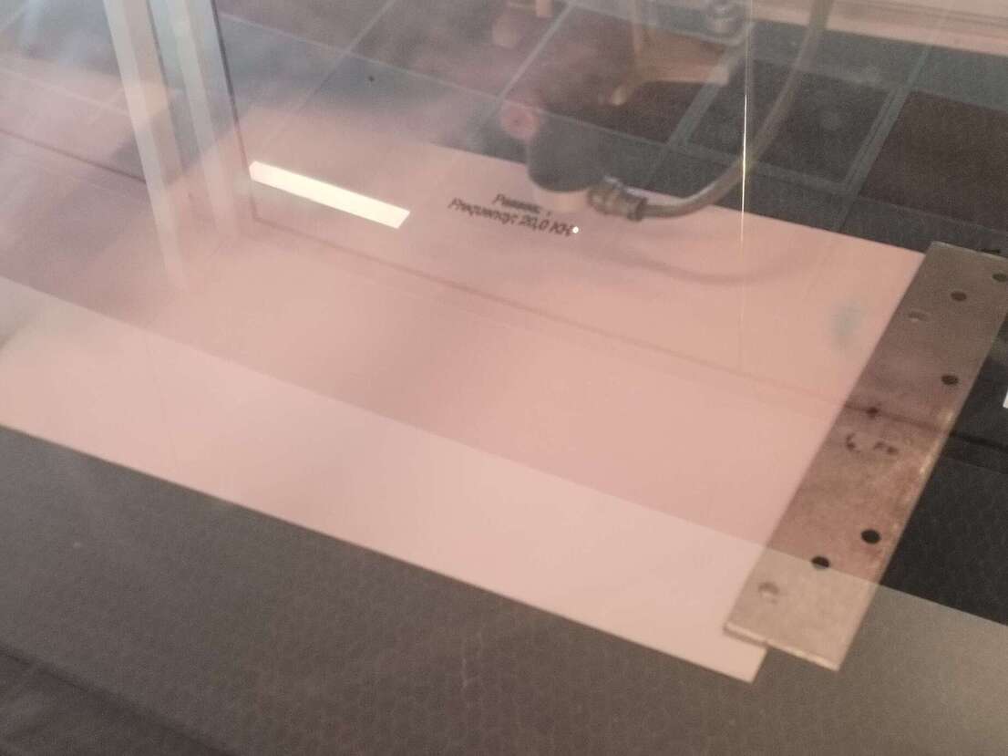 Each time you install a material inside the machine you have to adjust the focus and to add some weight on the border of the material in order to flatten its surface.