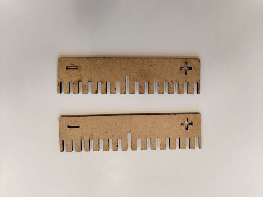 We then made a joint clearence test by cutting some comb-like shapes and joining them together. The thing is that each slit of the comb has a different width starting from the thickness of the material and adding some width on one side and substracting on the other.