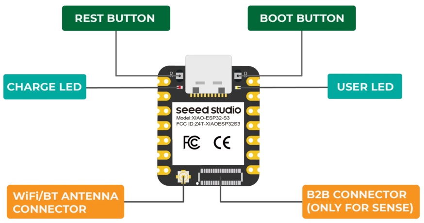 The microcontroller I got was already on a board (XIAO-ESP32-S3 by Seeed Studio) containing a USB-C port, a WiFi antenna connector and other features.