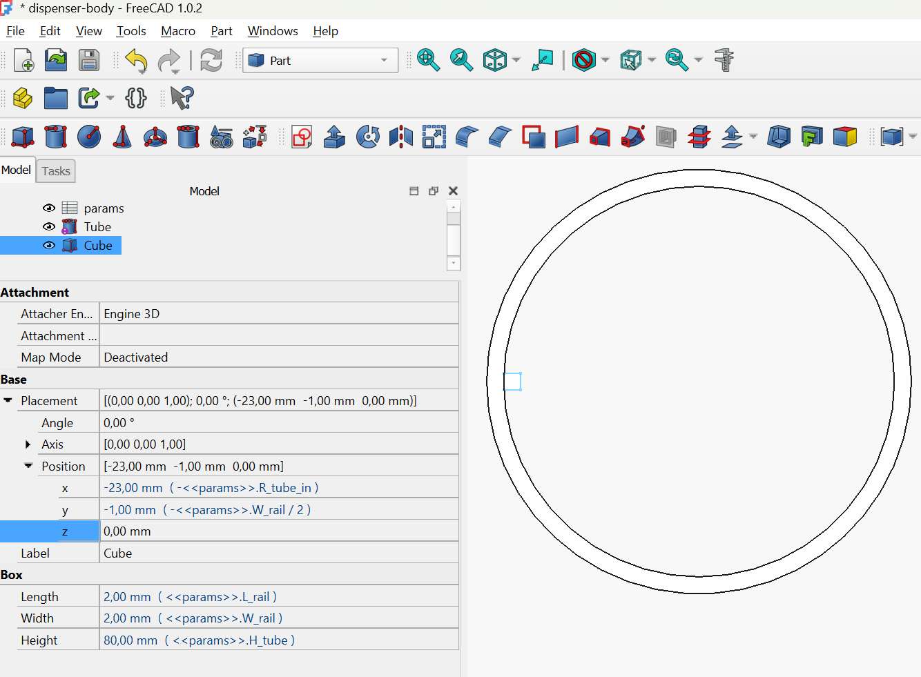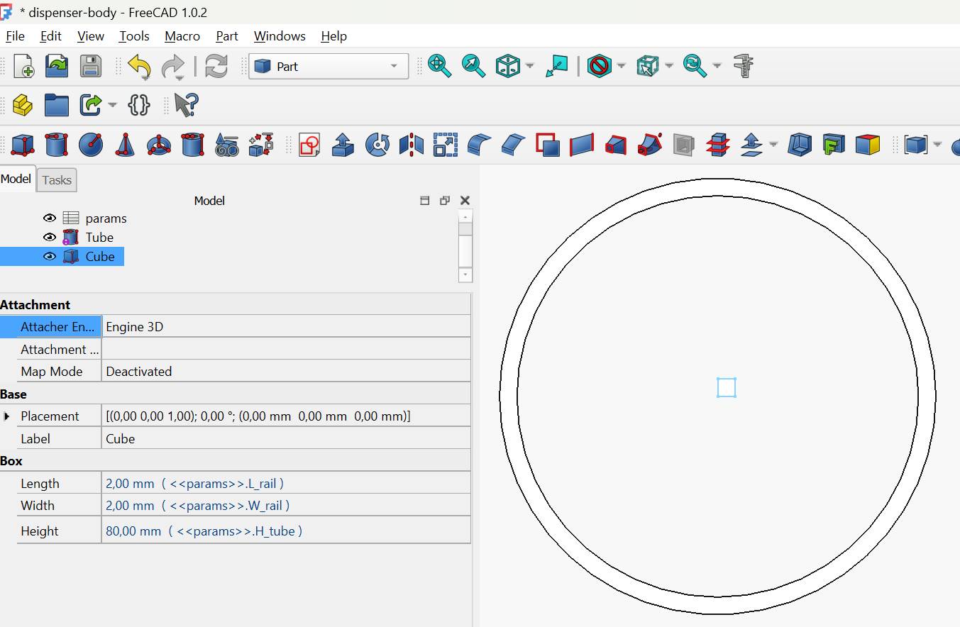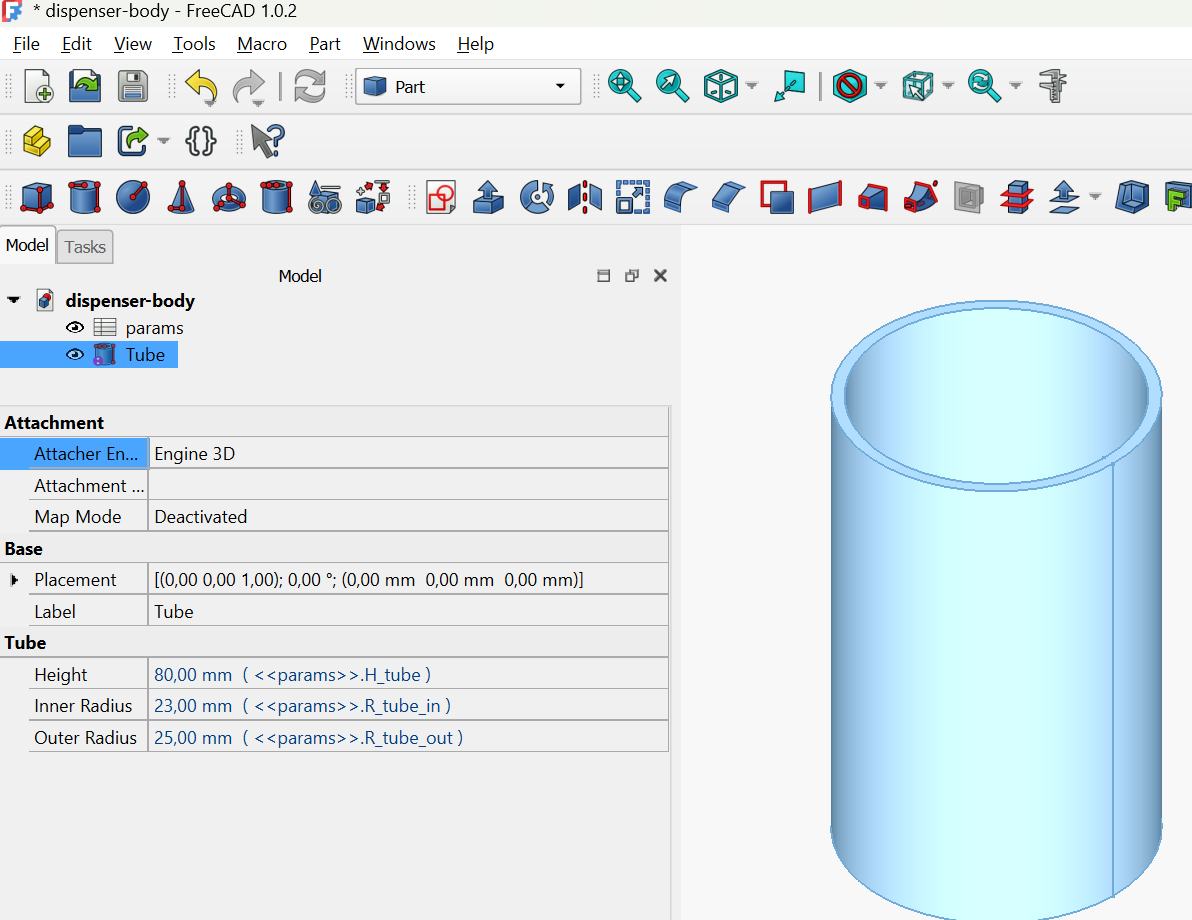 I added a tube primitive to start the dispenser body. I used the spreadsheet parameters to define its dimensions.