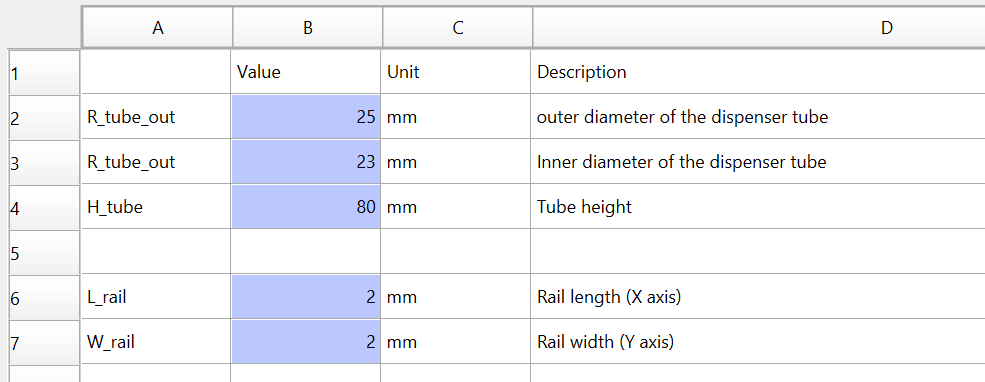 I started by defining the geometric parameters uin a spreadsheet. Each parameter has a name (used in object definition)and a value. I added its unit and a description for documentation.