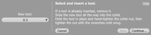 I select the end mill I will use, here since I start with the tracks, I choose the 0,3mm end mill and press Continue....