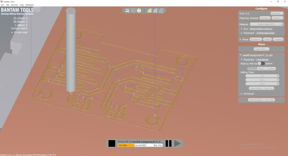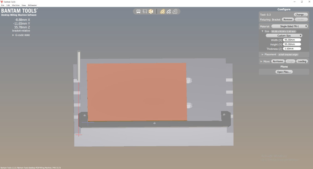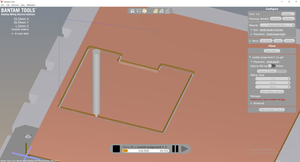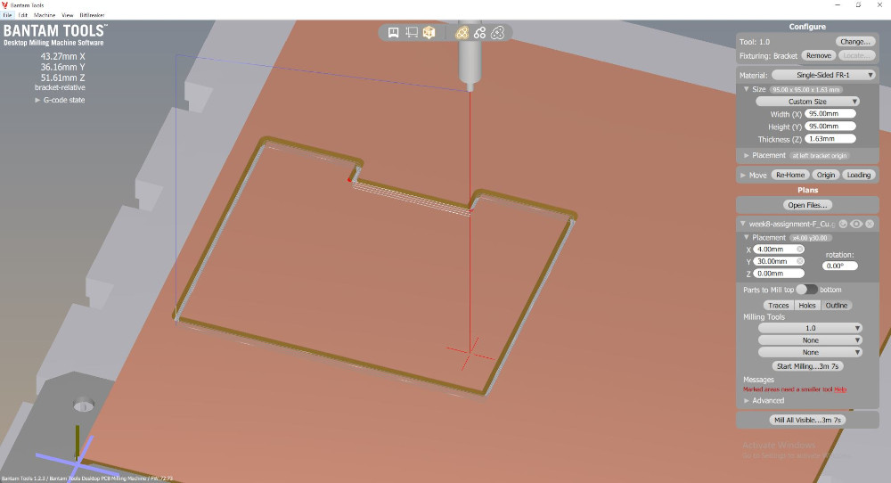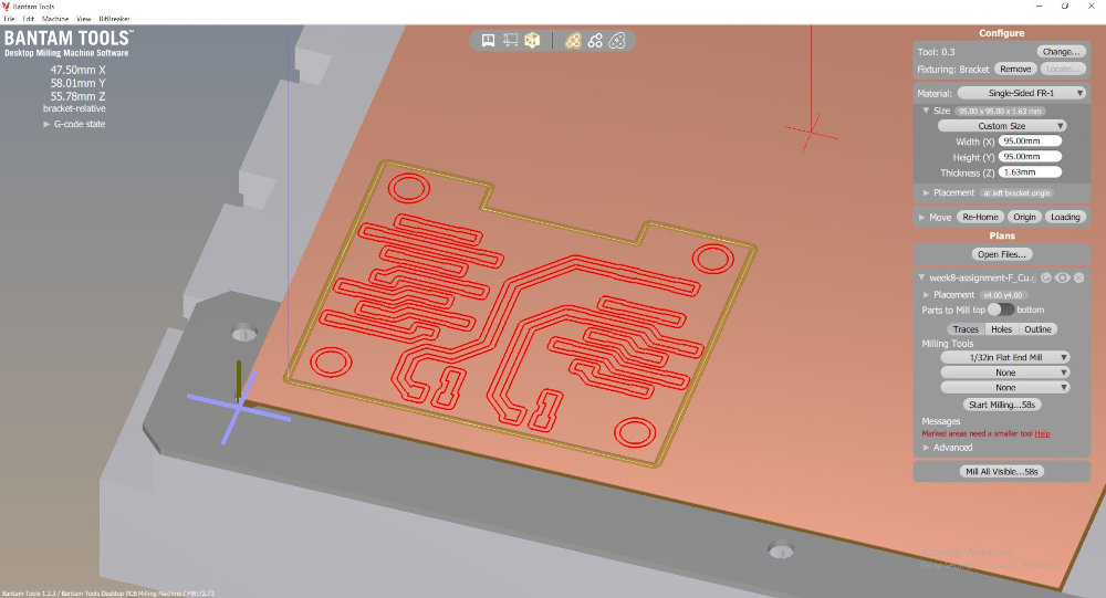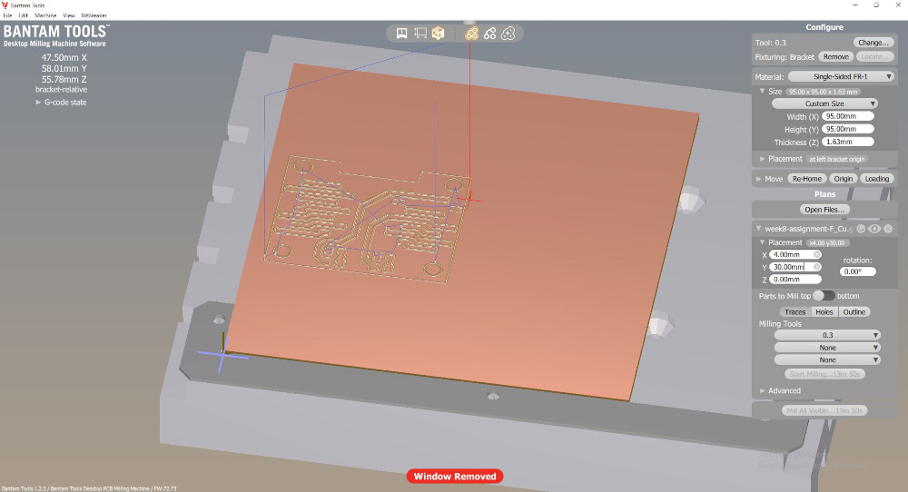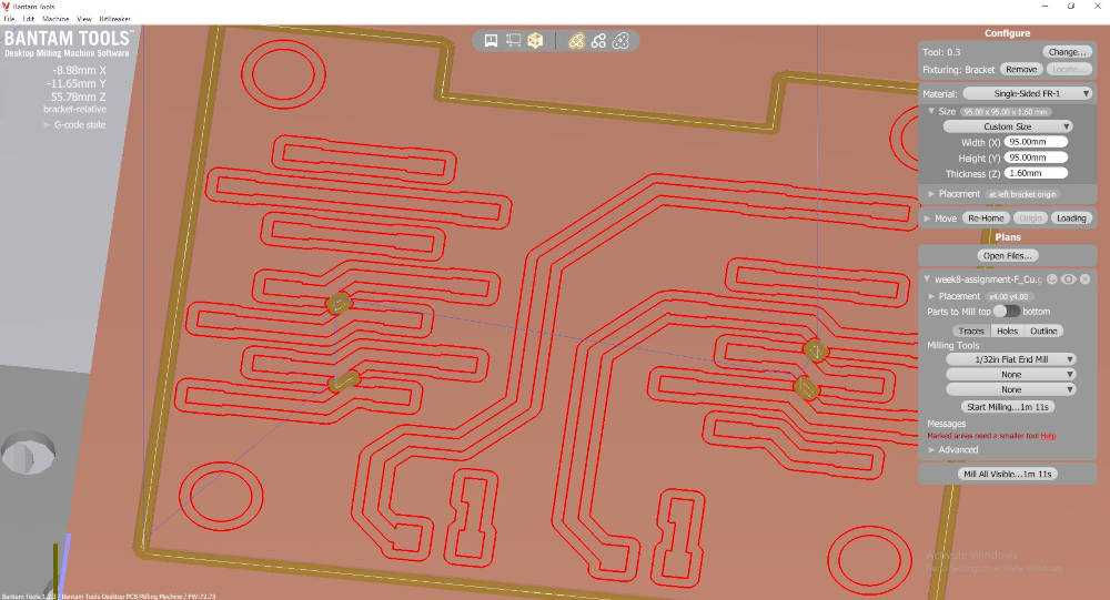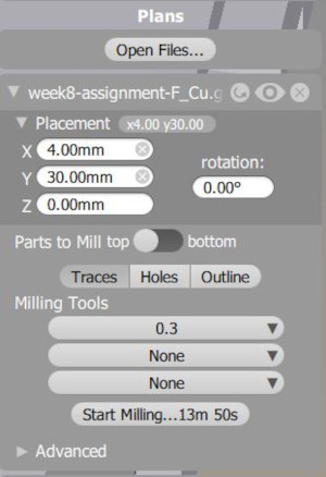 Then under Plans, I have to check Traces only, select the correct end mill and change the location of my PCB by pressing Placement and entering correct values because the board already has a hole due to Jonas using the machine before me.
